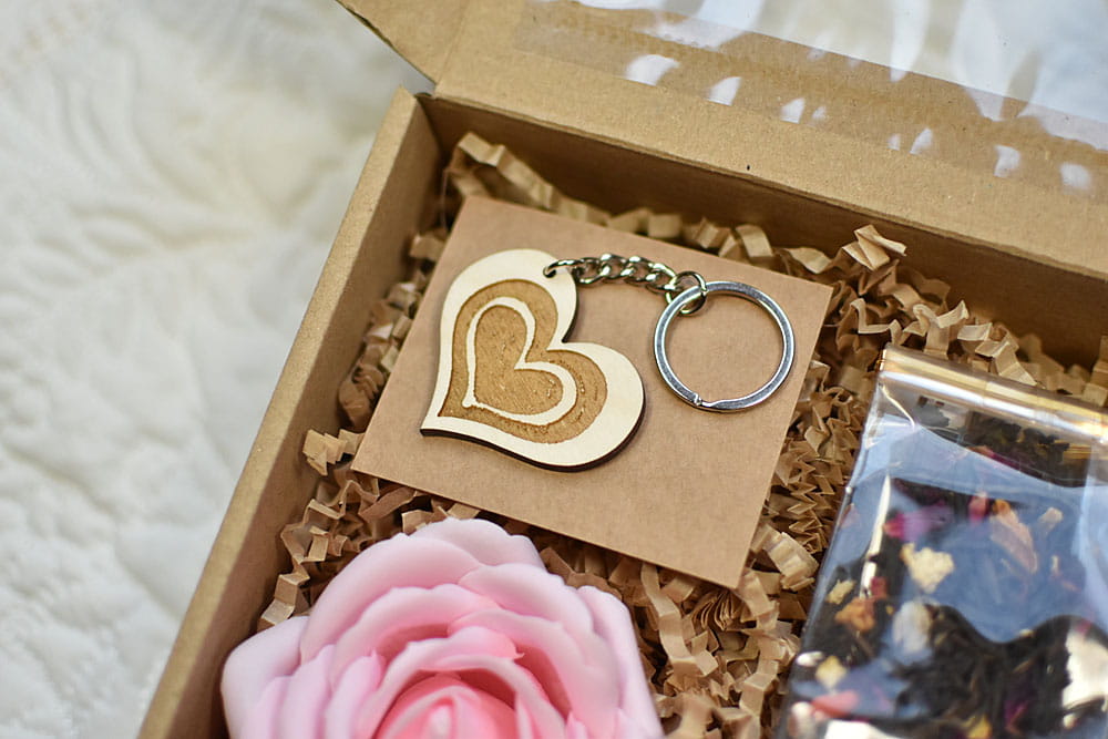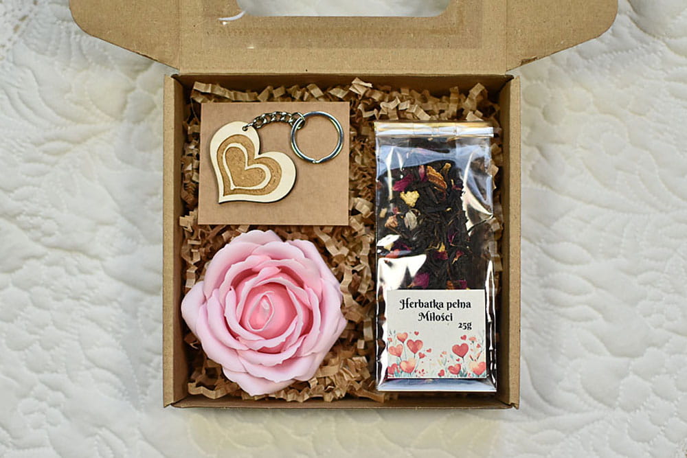 zestaw prezentowy na Dzień Kobiet z breloczkiem sercem i herbatą