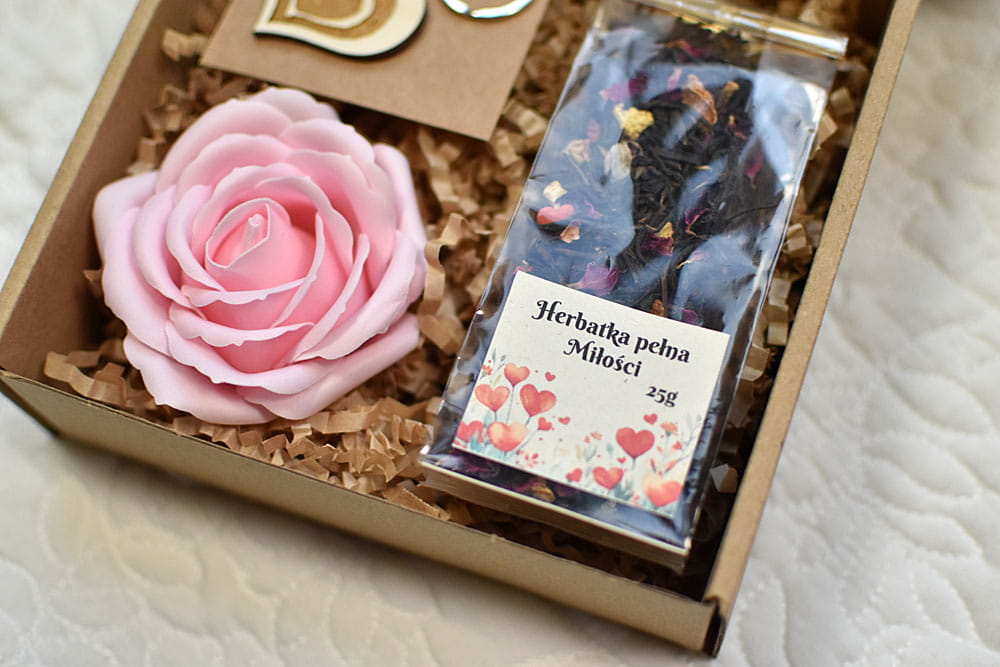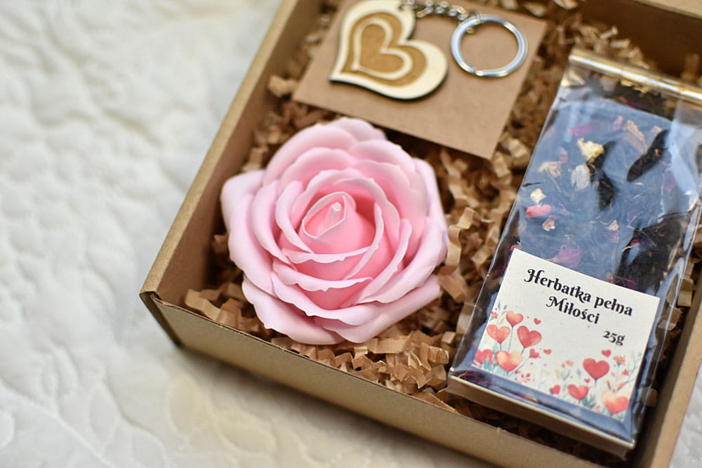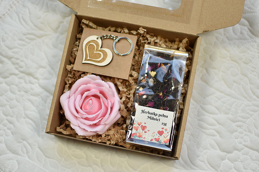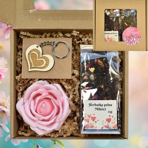 Box prezentowy z okazji Dnia Kobiet z brelokiem w kształcie serca, mydlaną różą oraz aromatyczną herbatą, całość pięknie zapakowana w eko pudełko.