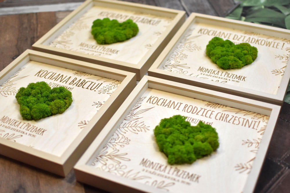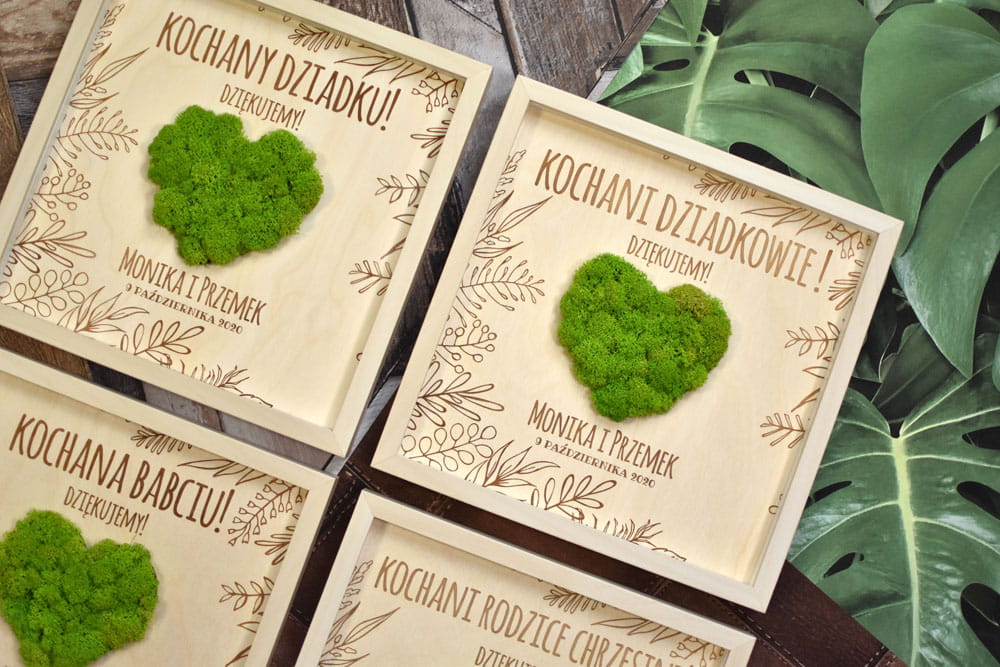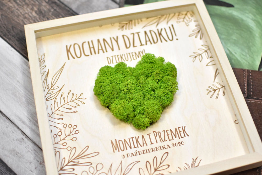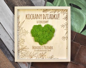 Zielone serce na Dzień Nauczyciela lub zakończenie roku szkolnego - oryginalny prezent od uczniów. Przestrzenny, grawerowany obraz został ozdobiony naturalnym mchem ze Skandynawii. Obraz można powiesić na ścianie lub postawić na biurku - z tyłu znajduje się rozkładana nóżka. Tekst jest dowolny, można go zmieniać w zależności od potrzeby i uroczystości.