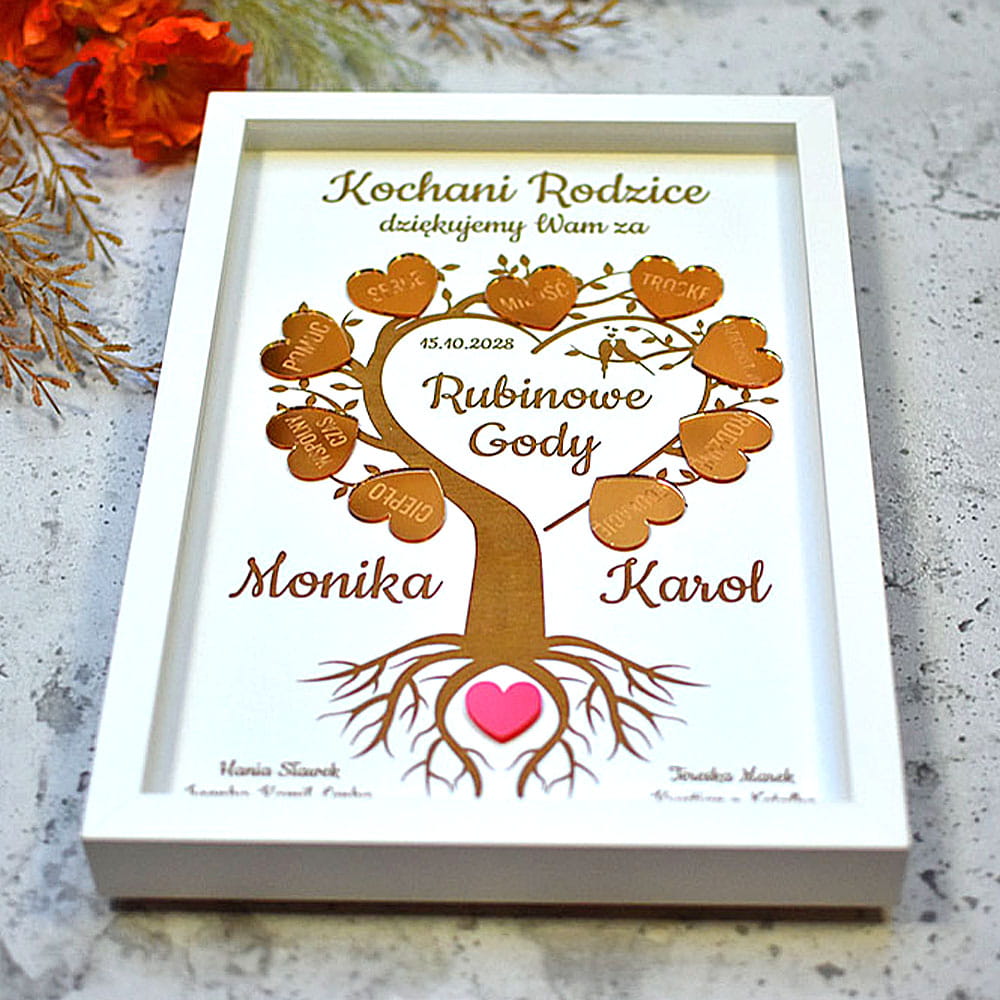 Szukacie spektakularnego prezentu z okazji rocznicy ślubu Waszych bliskich lub innej uroczystości? Podarujcie im przepiękny obraz 3D, ozdobiony złotymi lub srebrnymi lustrzanymi sercami. Serduszka pięknie się mienią w świetle, co dodatkowo zachwyca obdarowywanych. Tekst jest dowolny i każdy wzór można dostosować do dowolnej okazji jak np. Złote Gody, Rubinowe Gody, Diamentowe Gody, imieniny, urodziny, jubileusz, ślub itp.!