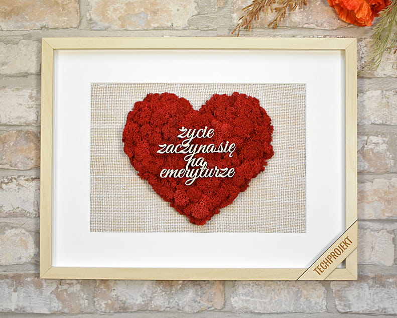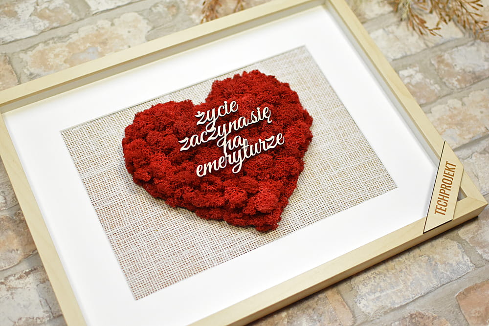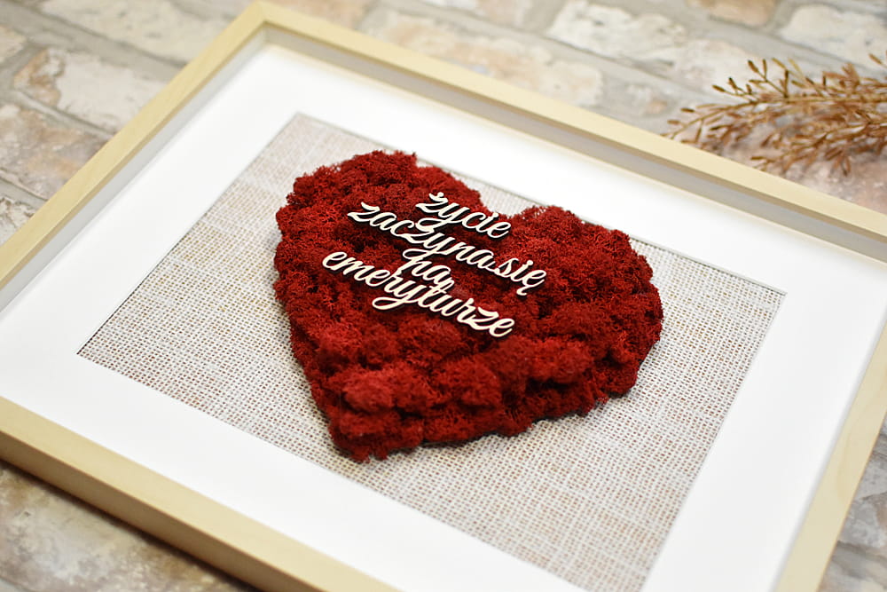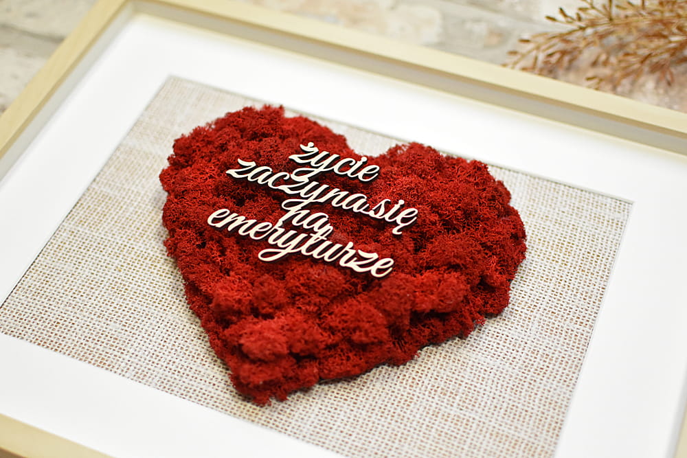 Życie zaczyna się na emeryturze, pamiątka na odejście na emeryturę dla koleżanki, kolegi, obraz czerwone serce z mchu