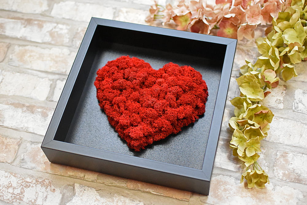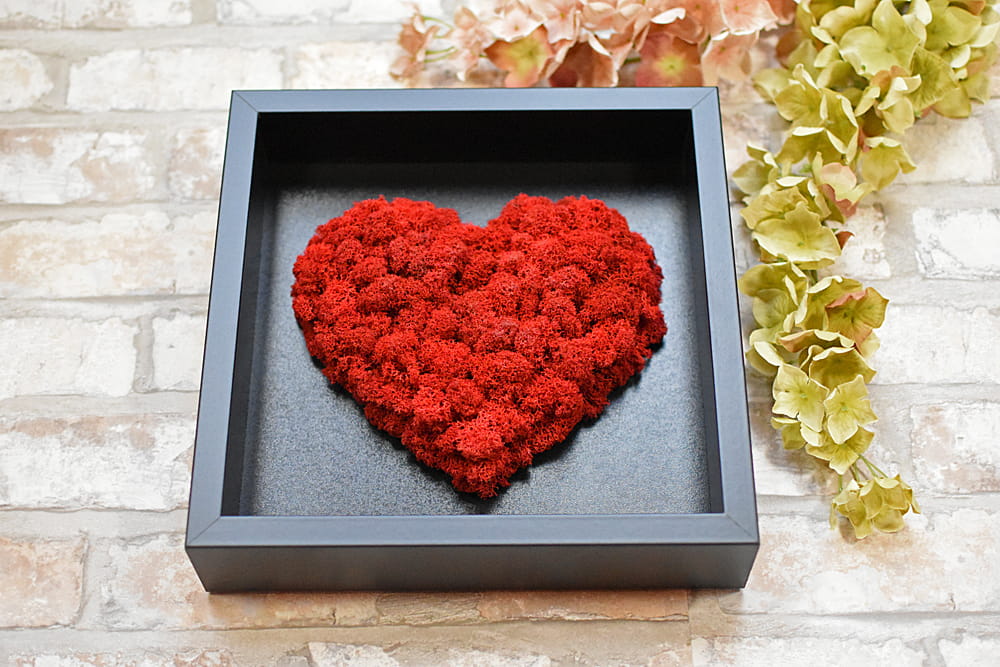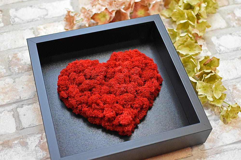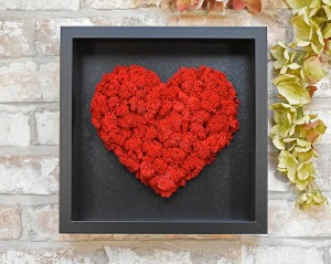 czerwone serce z naturalnego mchu w ramce, prezent na Walentynki, dekoracja ścienna