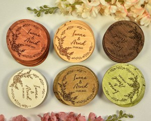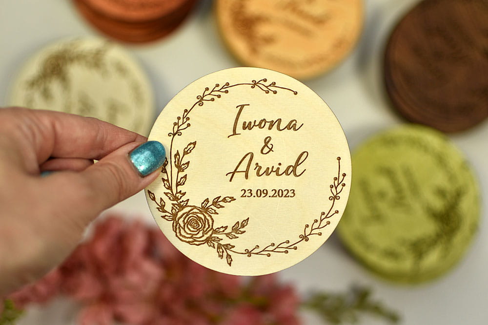 drewniana personalizowana podstawka pod herbatę, wianek z kwiatami róży