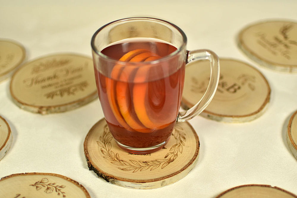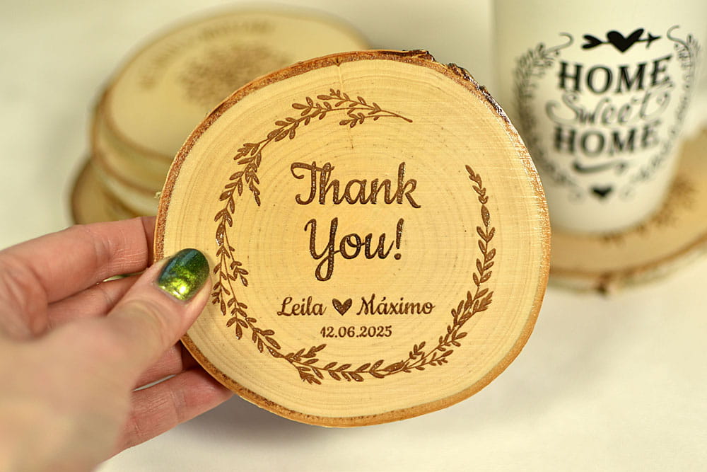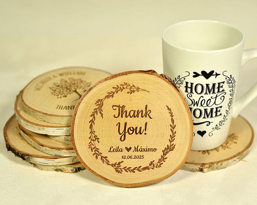 Podstawka pod kubek, filiżankę, kieliszek, wykonana z plastra brzozowego drewna. Pomysł na niecodzienny upominek. Na środku można wygrawerować dowolny napis i dodać ozdobną grafikę. W zależności od okazji podkładki można dostosować do różnych uroczystości jak wesele, urodziny, Chrzest, Komunia Święta czy rocznica. Na podkładce można umieścić także logo firmy.