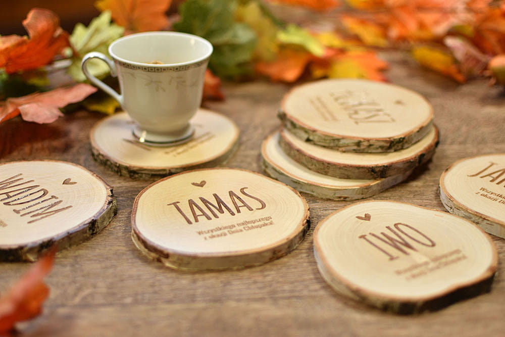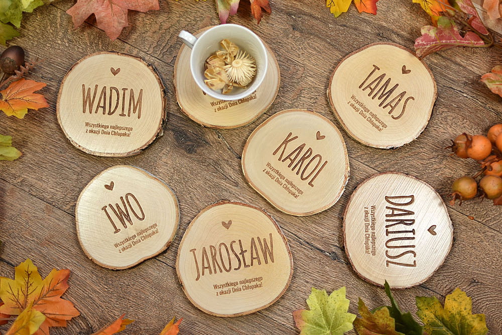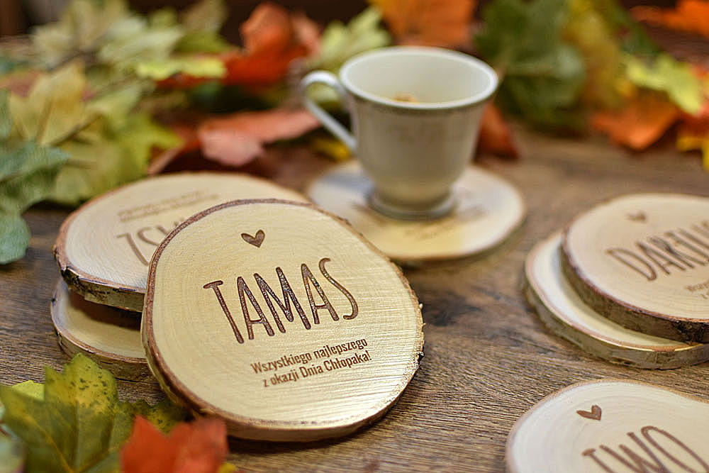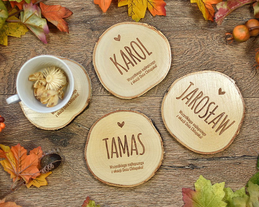 Oryginalny upominek na Dzień Chłopaka - podkładki pod kubek z wygrawerowanym imieniem chłopaka oraz okolicznościowym napisem. Wyjątkowy eko podarunek z naturalnego drewna brzozy. Na każdej podkładce zmieści się bez problemu kufel piwa.