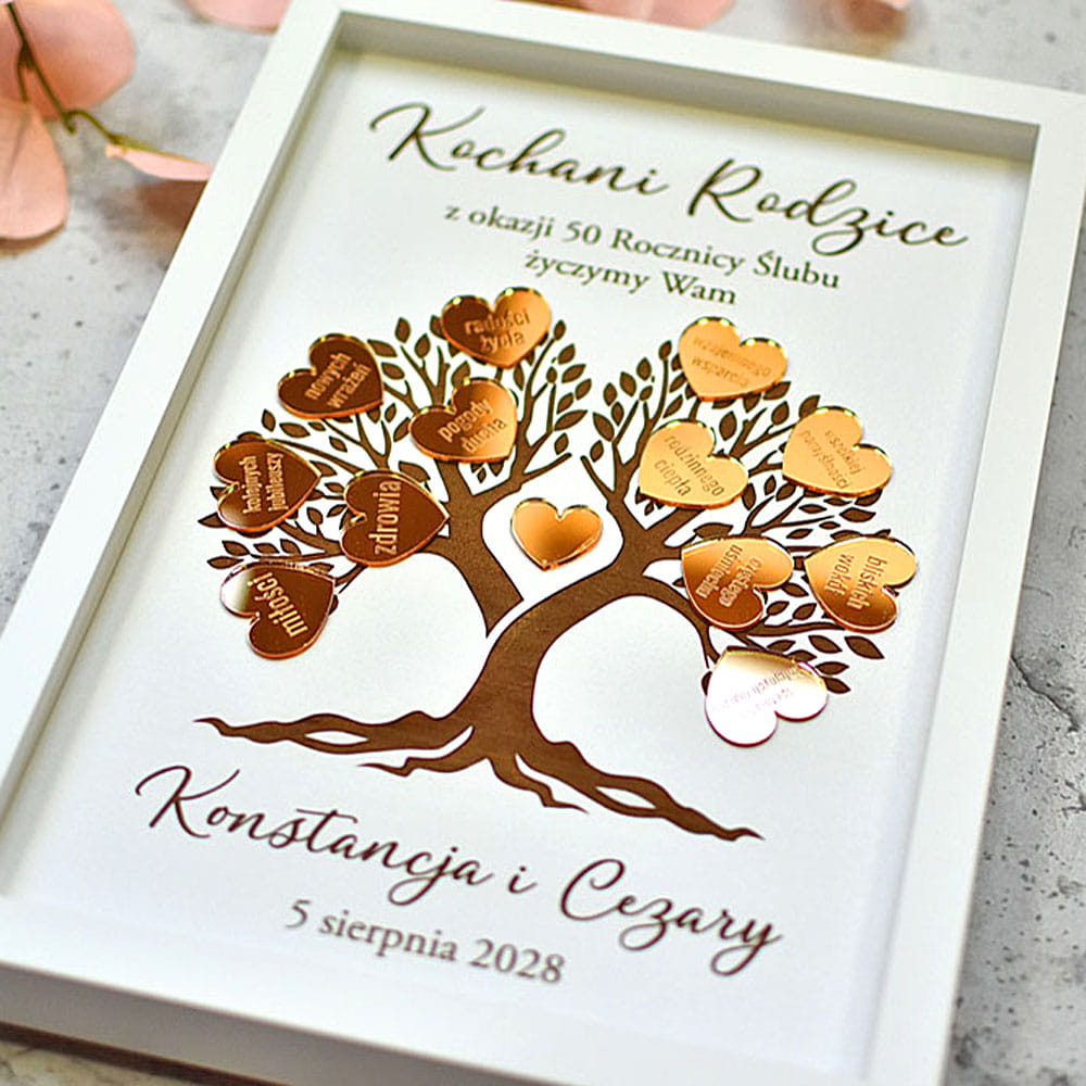 Drzewko Szczęścia dla Rodziców, Dziadków - prezent z okazji rocznicy ślubu, obraz ozdobiony złotymi sercami.