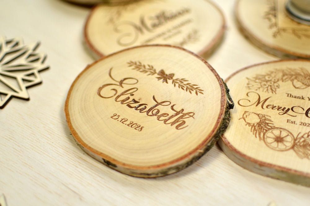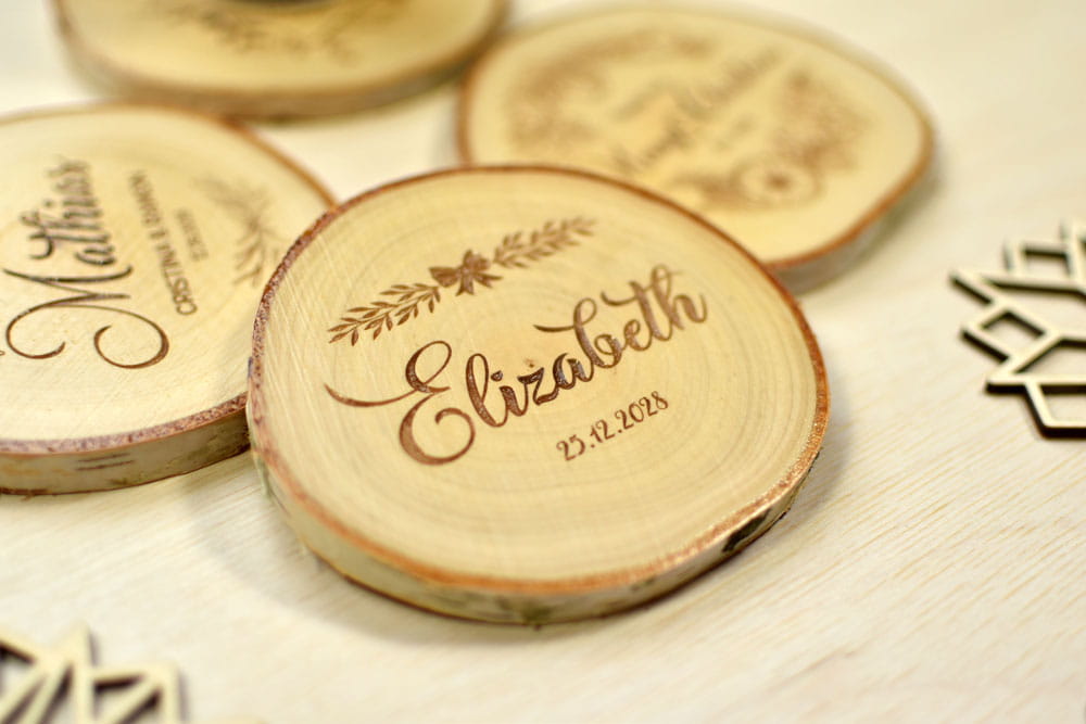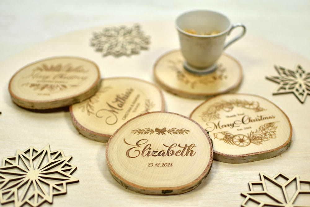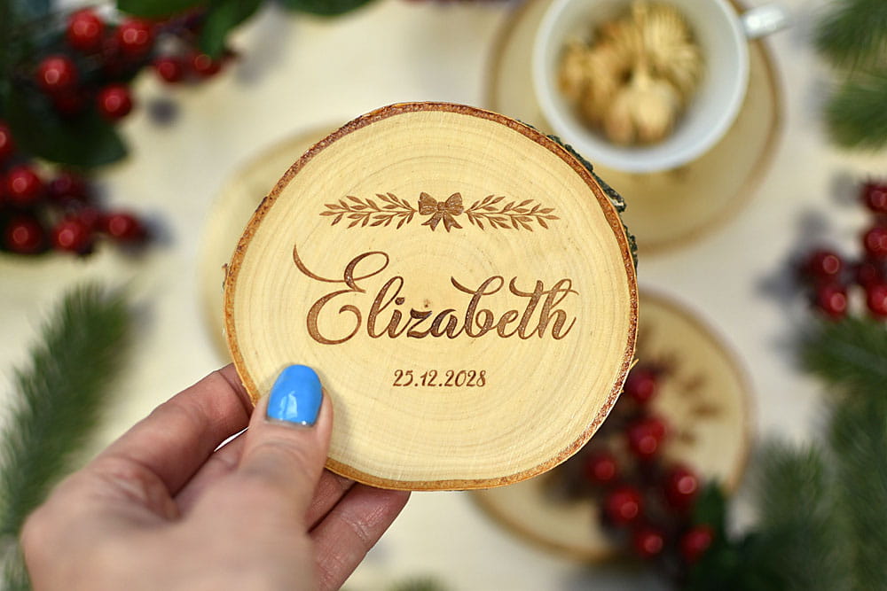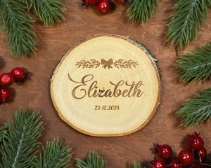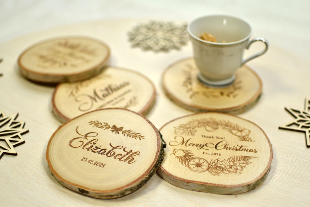 Pomysł na świąteczny bożonarodzeniowy prezent - podkładka pod kubek z imieniem obdarowywanej osoby lub innym napisem. Podkładka w bardzo modnym eko stylu - wykonana z plastra brzozy z wygrawerowanymi napisami. Na podkładce można postawić kubek, filiżankę czy kufel z piwem. Do wyboru jest osiem grafik w różnych stylach. Na podkładce można umieścić także logo firmy.
