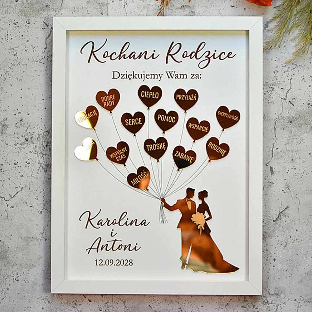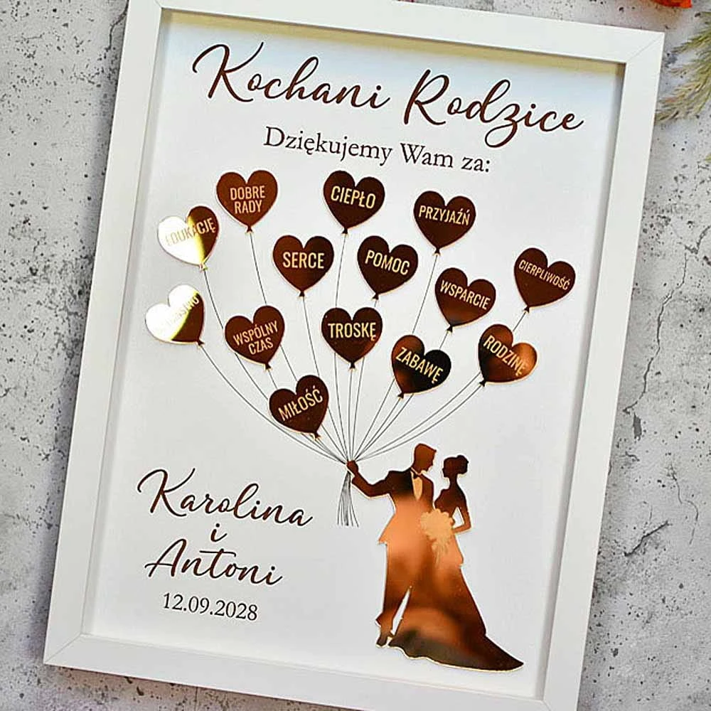 Wyjątkowy obraz w ramce z grawerowanymi, złotymi sercami balonikami trzymanymi przez Młodą Parę -prezent dla rodziców na weselu. Poszczególne serca mają wygrawerowane napisy takie jak miłość, przyjaźń, serce - czyli wszystko, za co chcielibyście podziękować Waszym życiowym opiekunom. Złote elementy pięknie się mienią w świetle, co dodatkowo zachwyca obdarowywanych. Górne i dolne napisy są dowolne, można je zmienić na podziękowanie dla Chrzestnych, podziękowanie dla Mamy czy Dziadków.