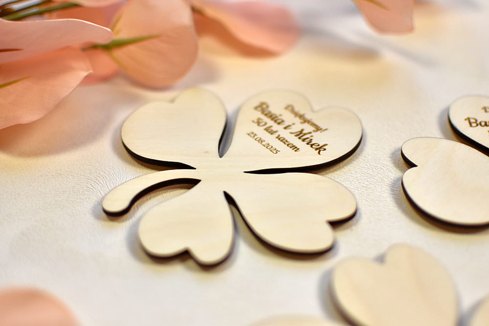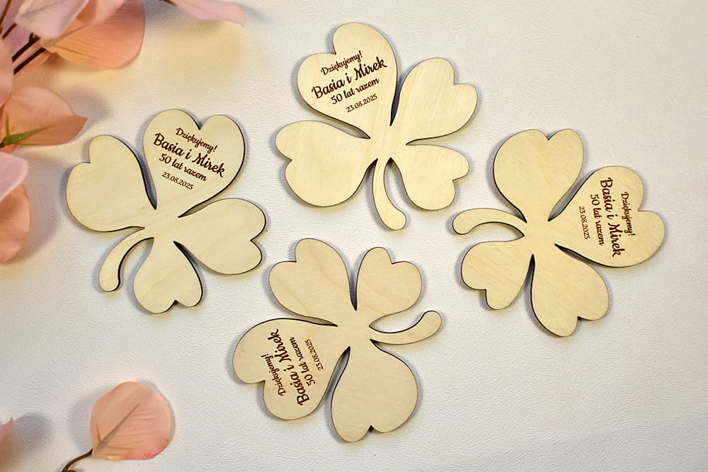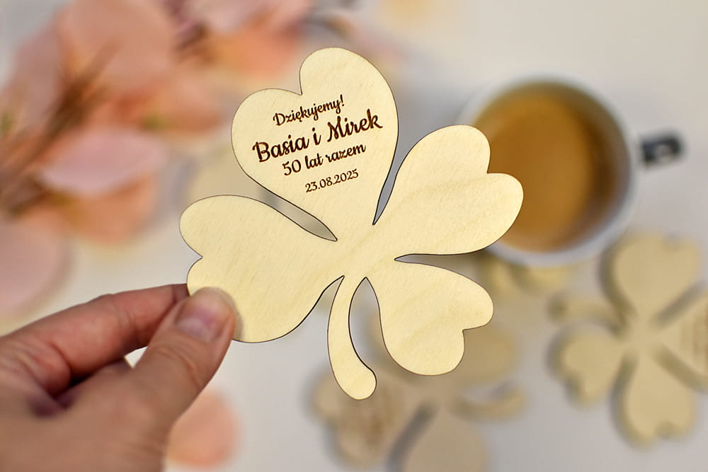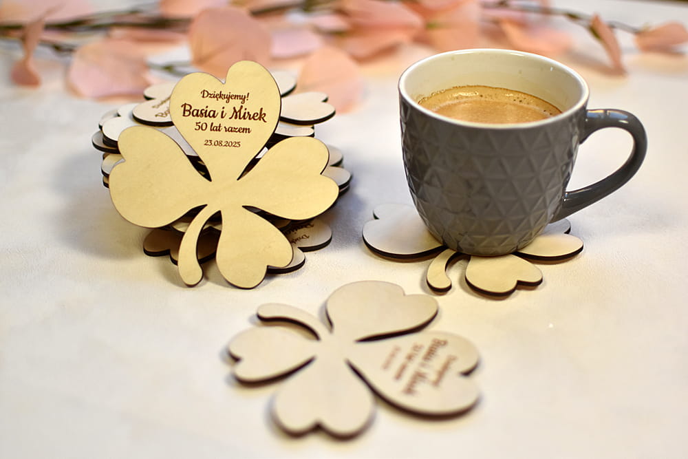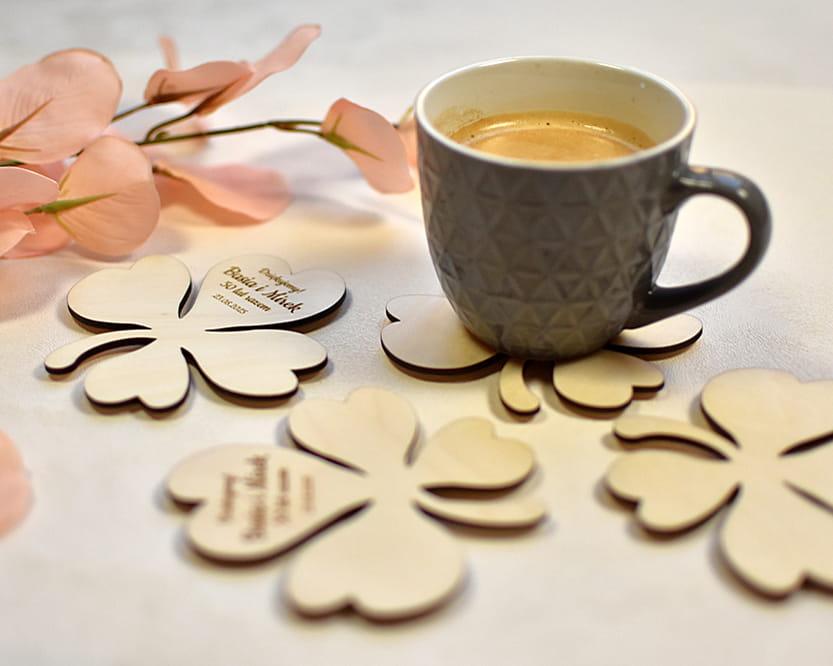 Miły prezent dla Waszych gości - personalizowana, drewniana podkładka pod kubek w kształcie liścia koniczynki.