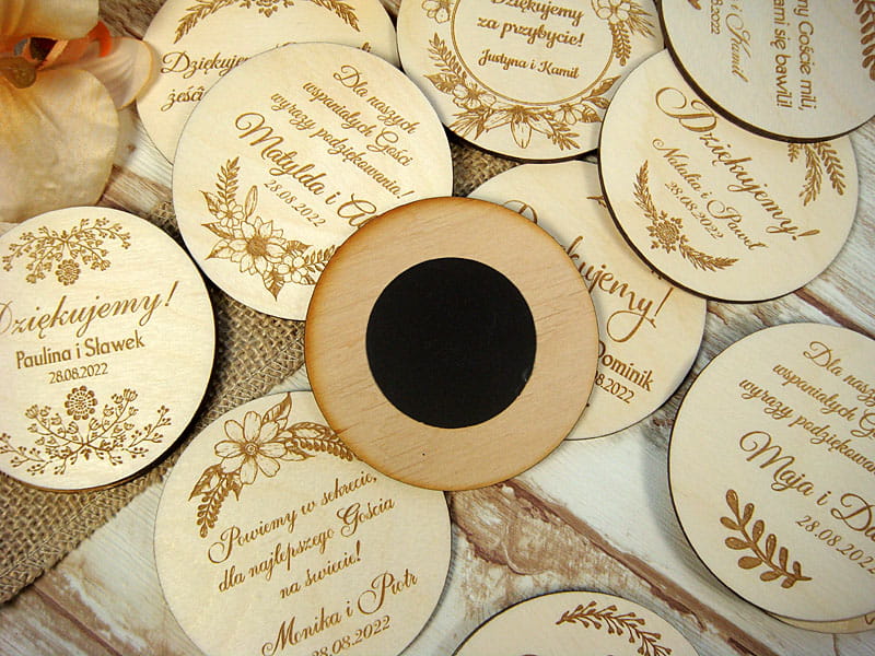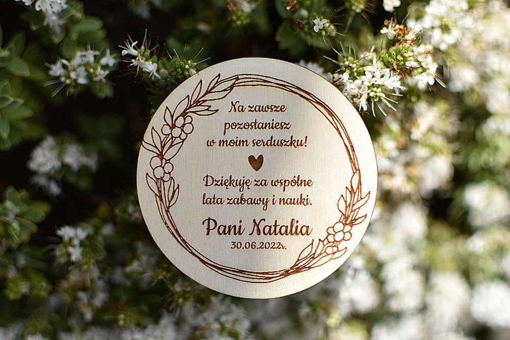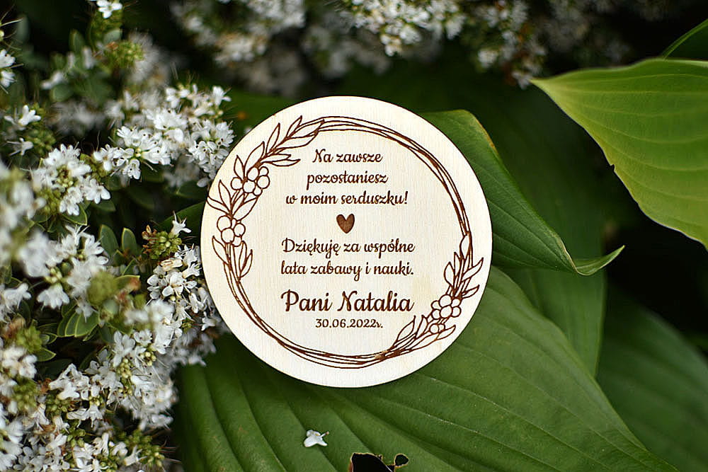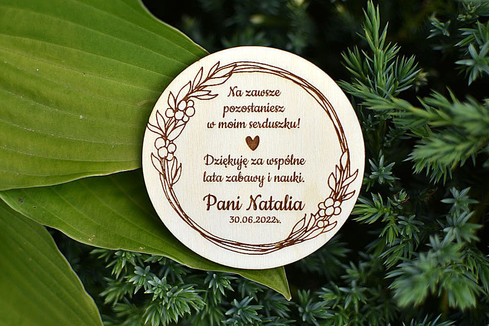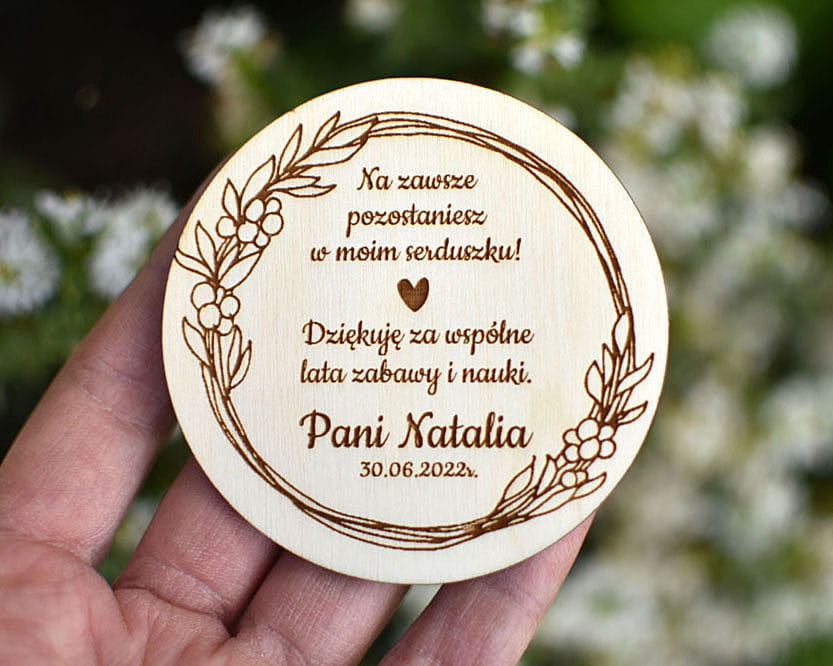 Upominek na zakończenie roku szkolnego od nauczyciela dla uczniów. Personalizowany magnes na lodówkę wykonany z drewna. Sympatyczna pamiątka na zakończenie wspólnej edukacji. Na magnesie można umieścić dowolny tekst.