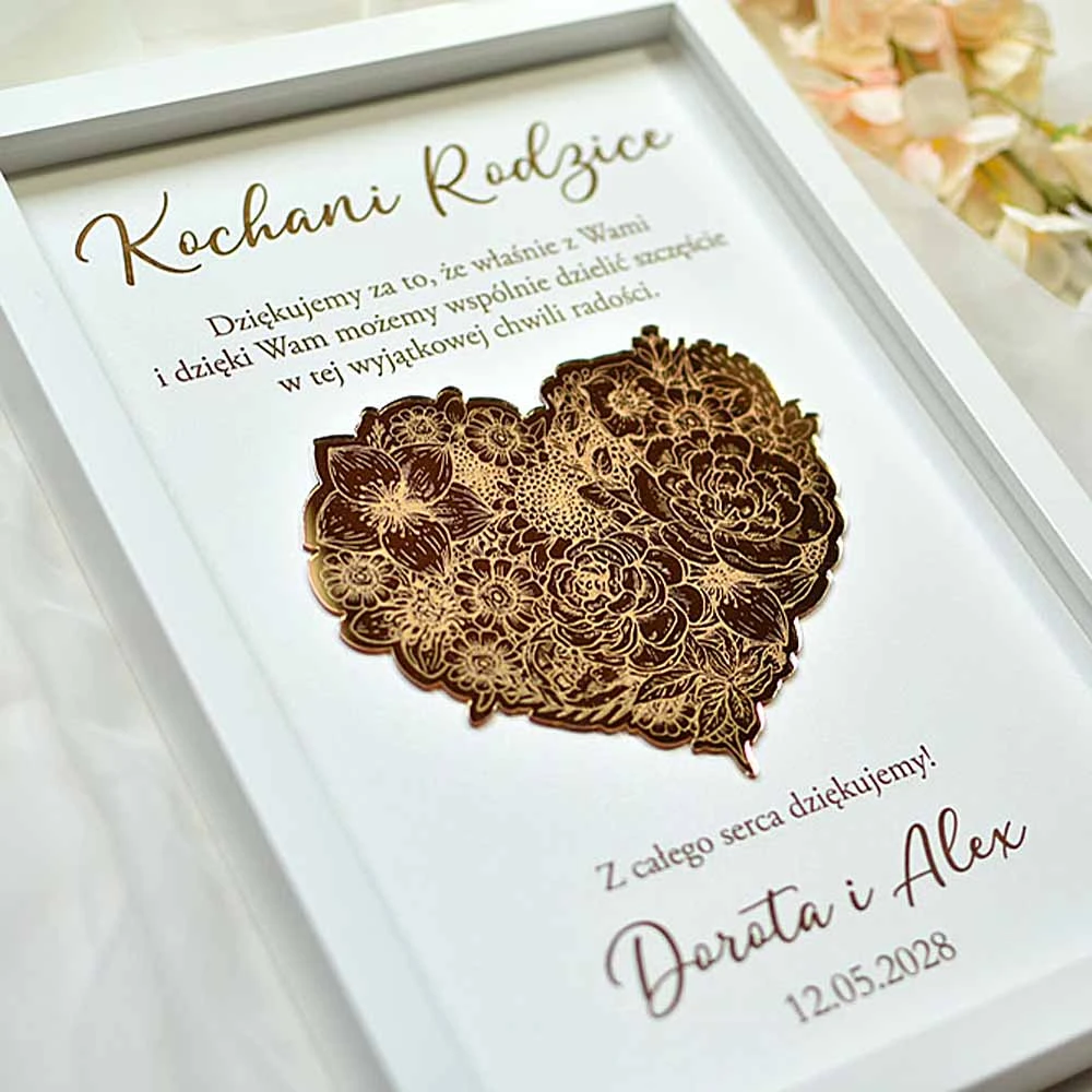 Szukacie eleganckiego podziękowania dla Rodziców na weselu? Podarujcie im wspaniały prezent w postaci obrazu, ozdobionego złotym, lustrzanym sercem z kwiatów. Serce pięknie się mieni w świetle, co dodatkowo zachwyca obdarowywanych. Tekst jest dowolny i możesz podziękowanie dostosować do Chrzestnych, Babci, Dziadka albo do dowolnej innej osoby lub do innej uroczystości. Obraz można podarować także nauczycielowi na zakończenie roku szkolnego albo Mamie na Dzień Matki czy nawet koleżance odchodzącej z pracy.