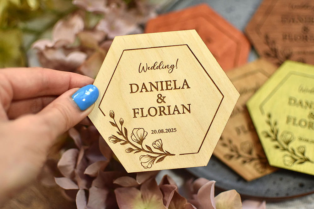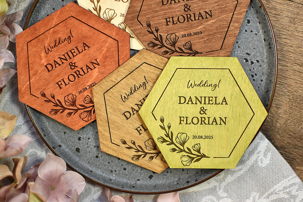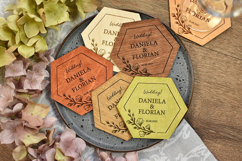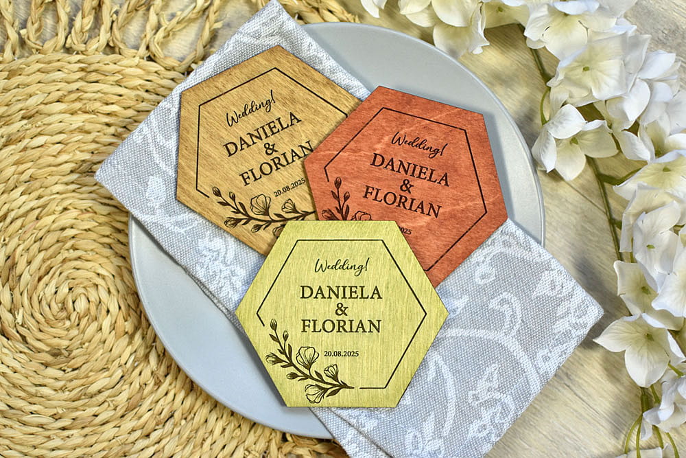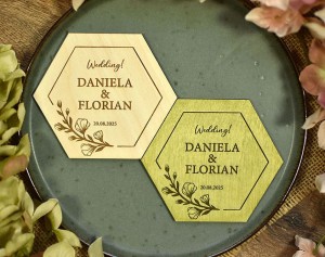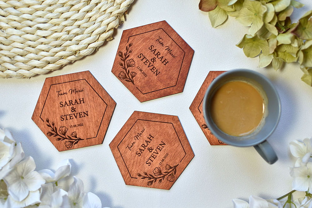 pamiątki weselne dla gości, personalizowane podstawki pod kubek w kształcie heksagonu