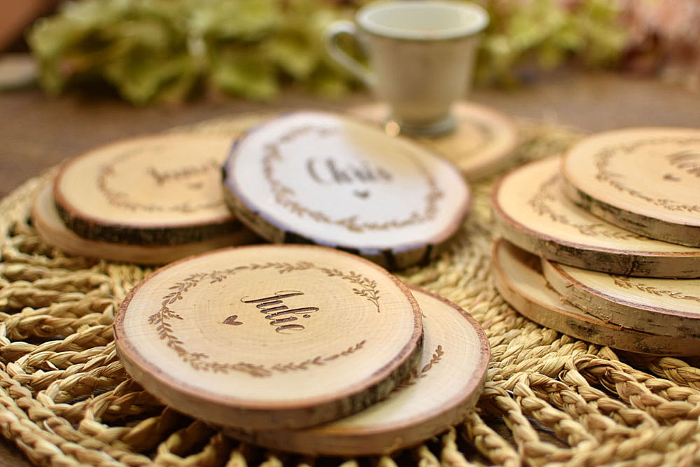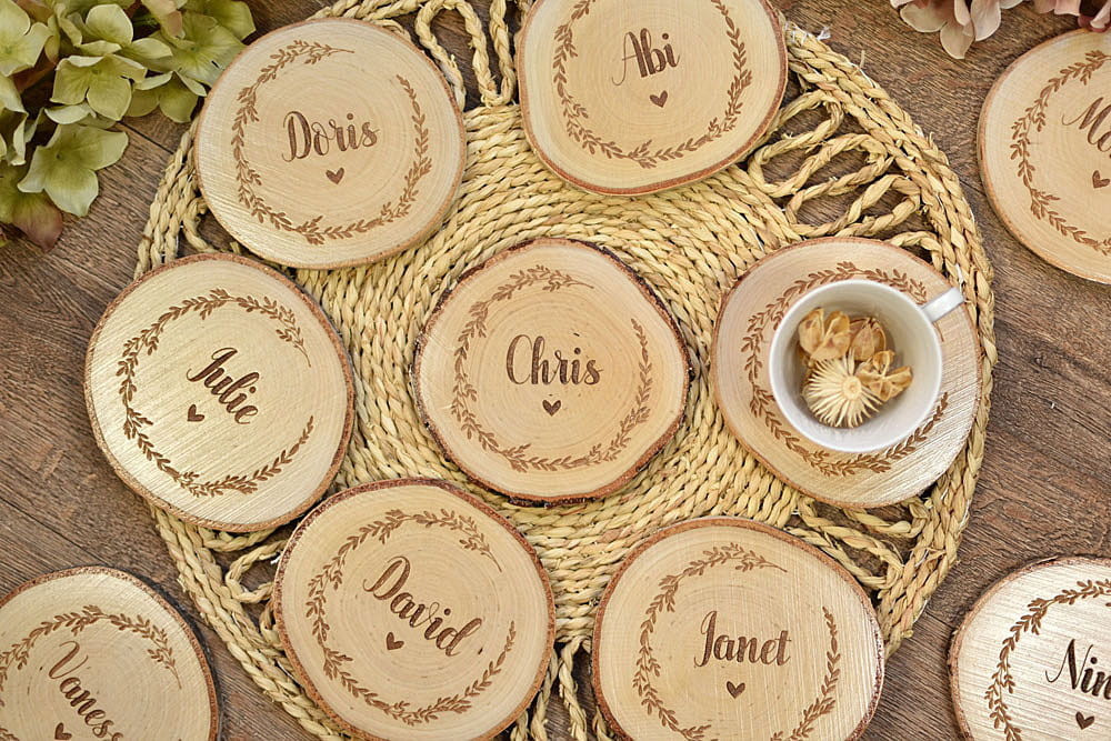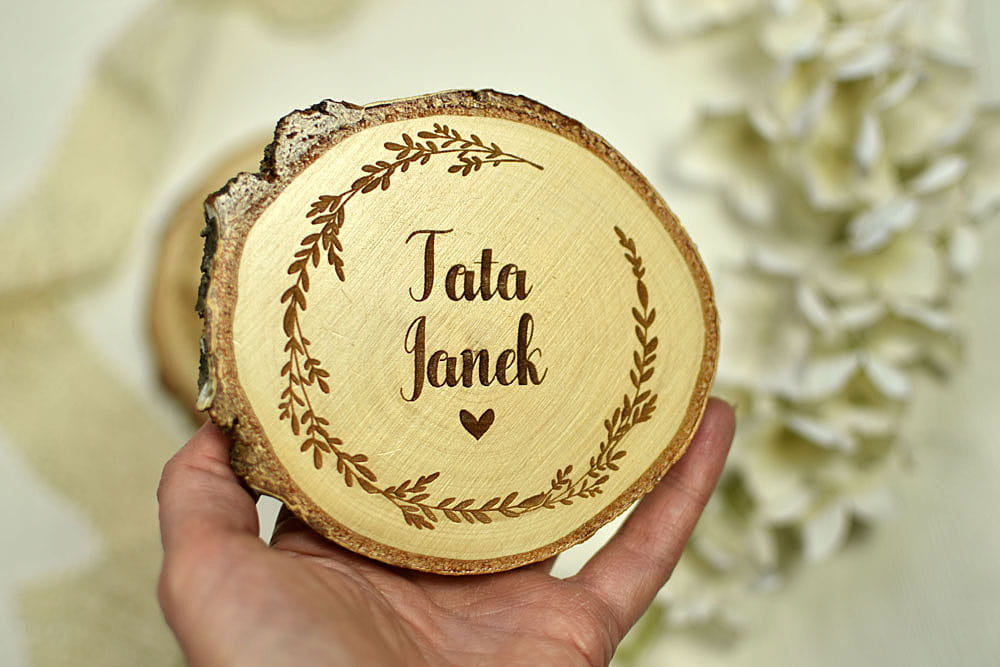 Pomysł na winietkę i jednocześnie niecodzienny podarunek dla gości. Na środku można wygrawerować imię gościa, można dodać datę lub inny napis. W zależności od okazji podkładki można dostosować do różnych uroczystości jak wesele, urodziny, Chrzest, Komunia Święta czy rocznica. Na podkładce można umieścić także logo firmy.