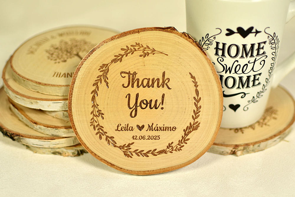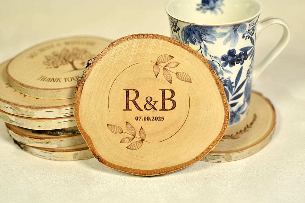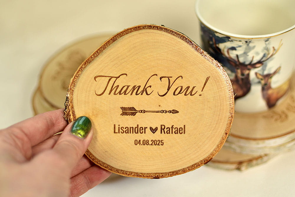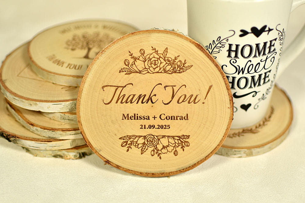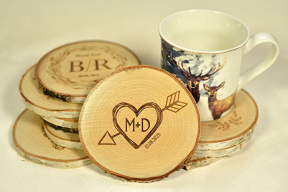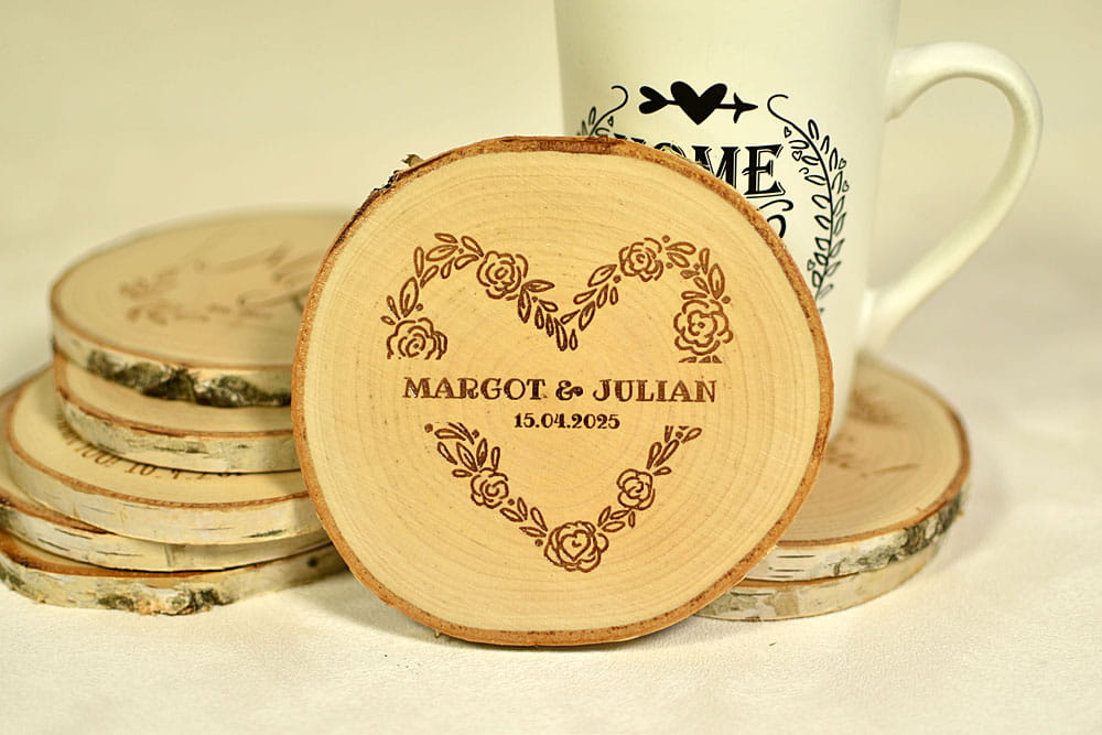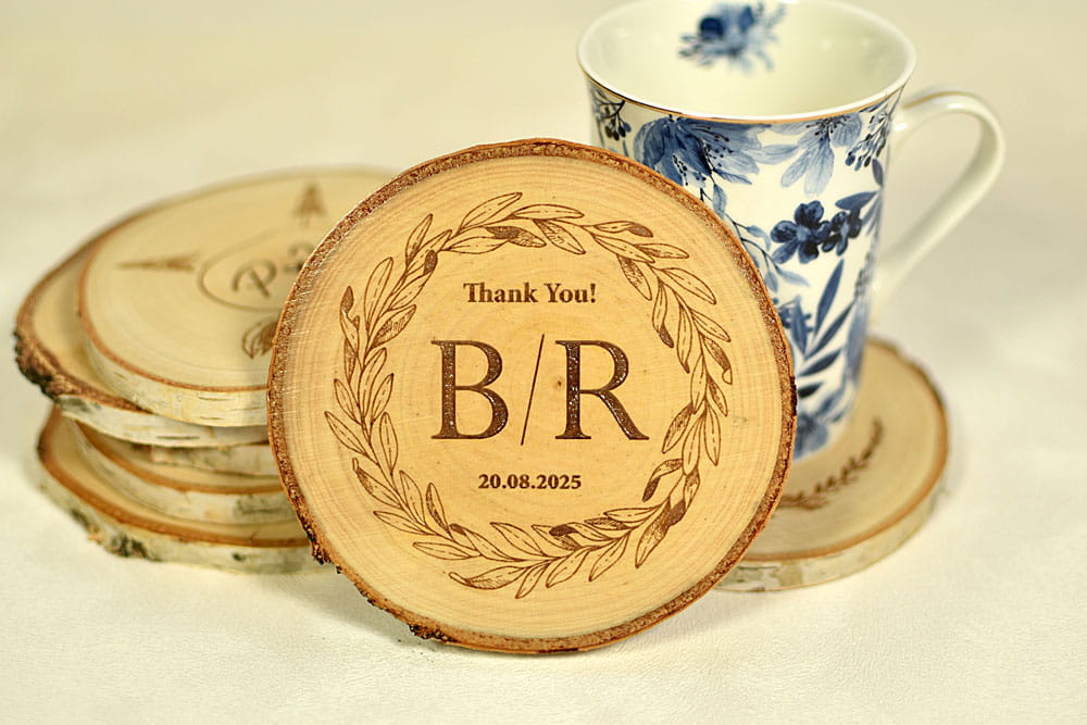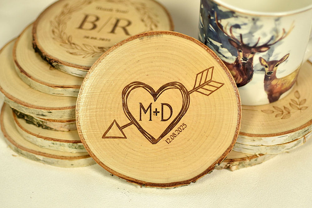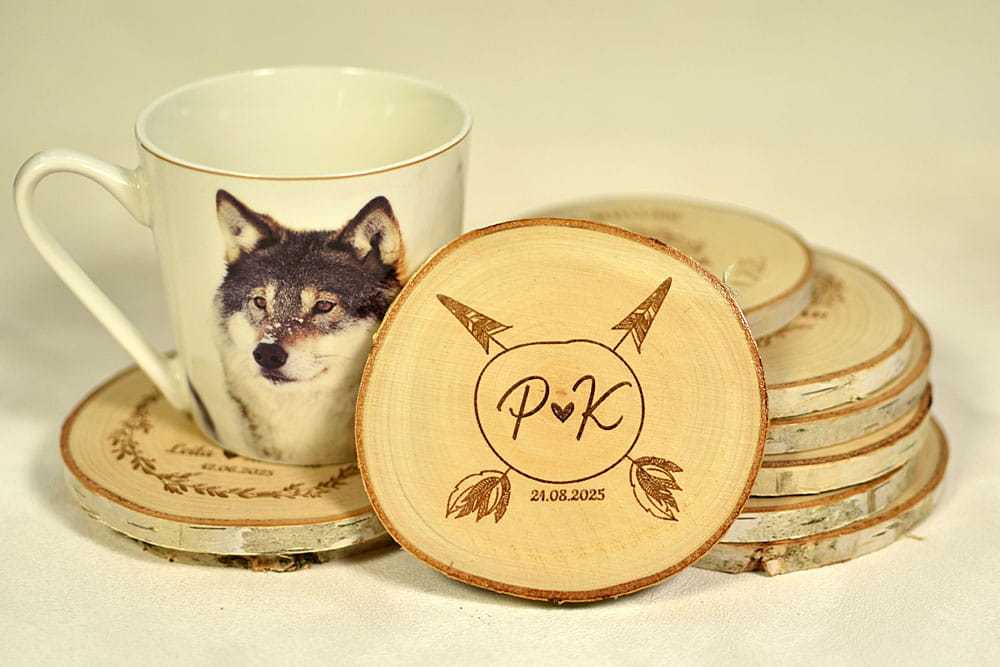 Personalizowane podkładki pod kubek, kufel, filiżankę, wykonane z plastrów drewna brzozy. Pomysł na niecodzienny upominek, zwłaszcza na takich uroczystościach jak ślub, urodziny, prezent dla pracowników, klientów, jubileusz, rocznica. Na zdjęciach różne grafiki do wyboru. Na plastrach można wygrawerować dowolny napis i dodać grafikę, można umieścić także logo firmy. Można wygrawerować także imię, wtedy podkładka może pełnić rolę winietki na stole.