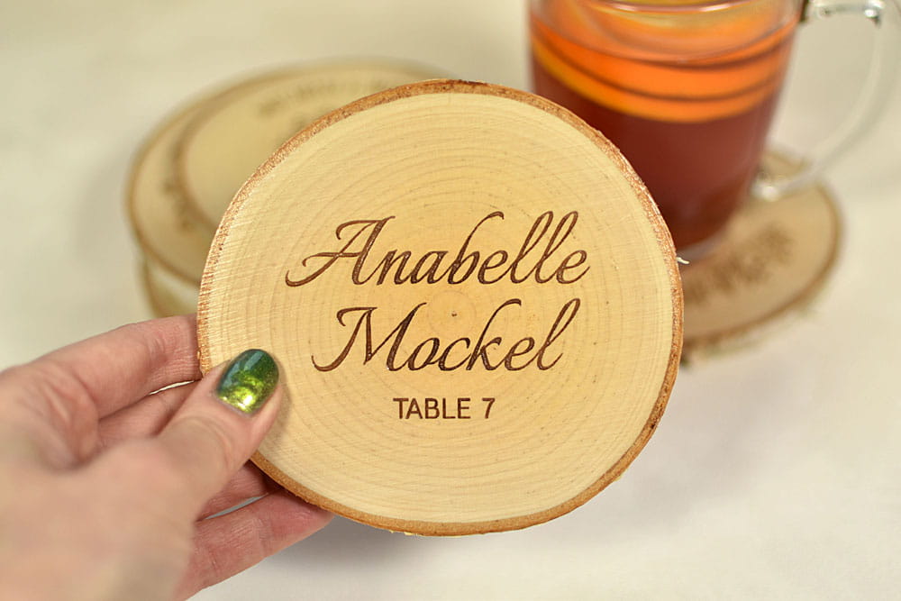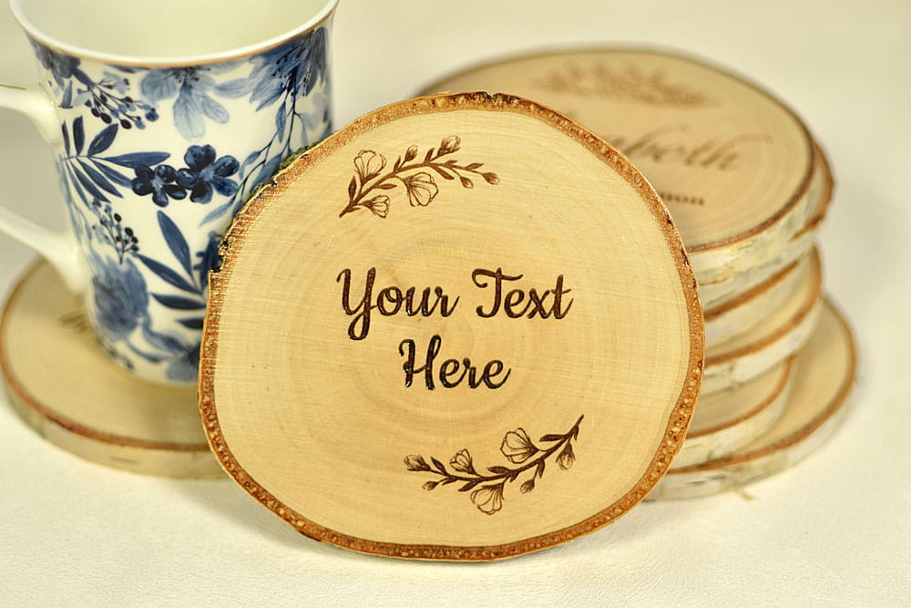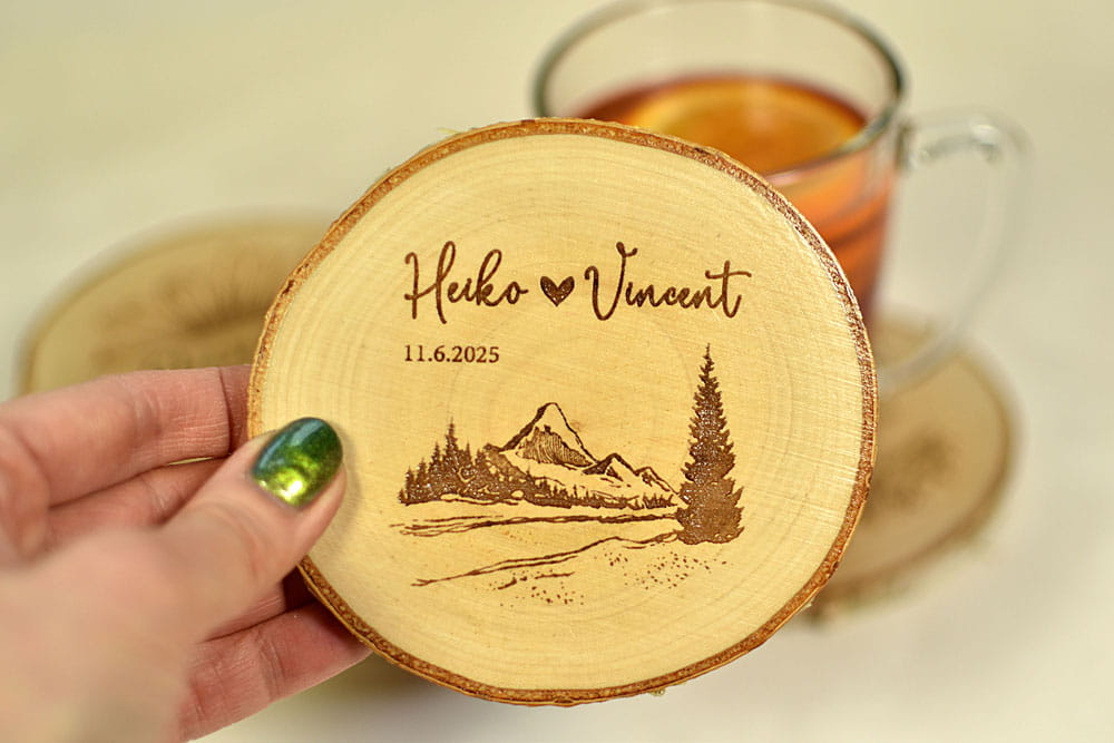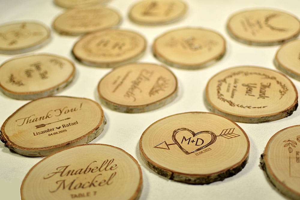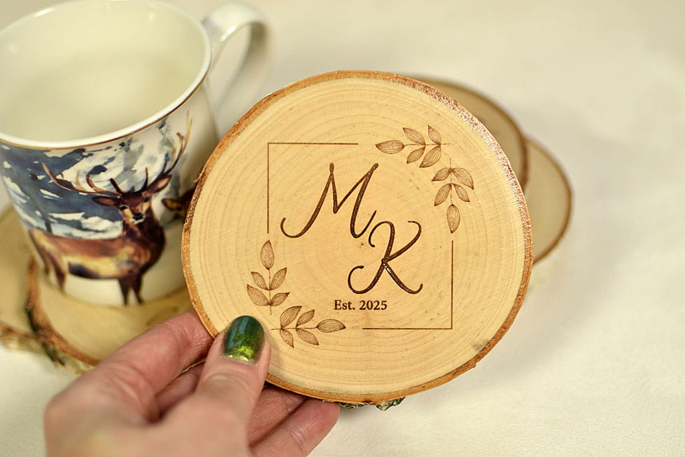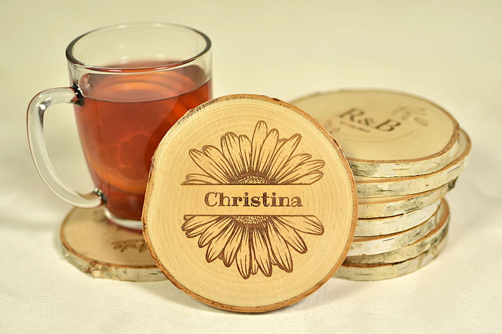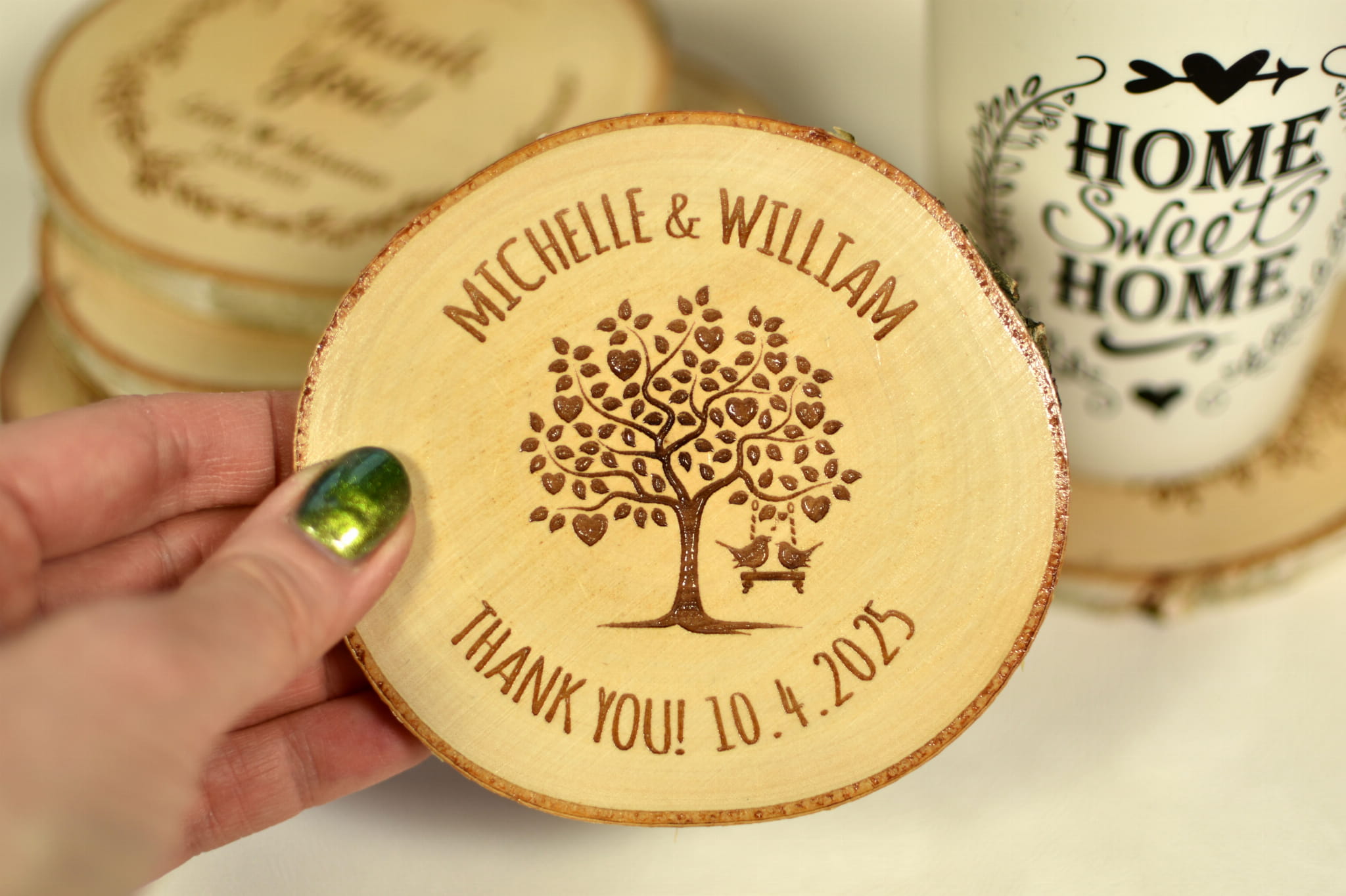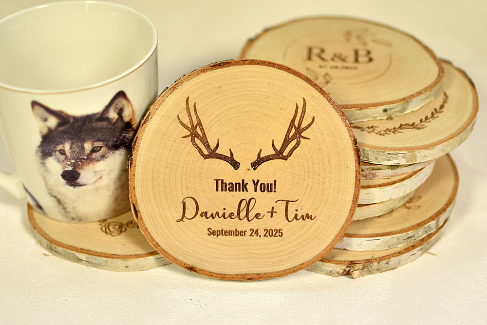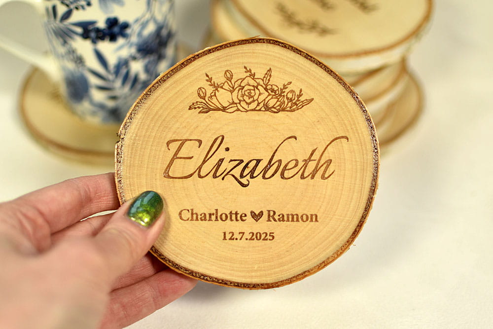 Personalizowane podkładki pod kubek, kufel, filiżankę, wykonane z plastrów drewna brzozy. Pomysł na niecodzienny upominek, zwłaszcza na takich uroczystościach jak ślub, urodziny, prezent dla pracowników, klientów, jubileusz, rocznica. Na zdjęciach różne grafiki do wyboru. Na plastrach można wygrawerować dowolny napis i dodać grafikę, można umieścić także logo firmy. Można wygrawerować także imię, wtedy podkładka może pełnić rolę winietki na stole.