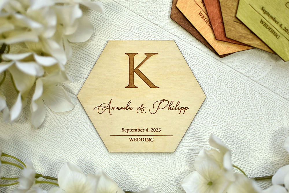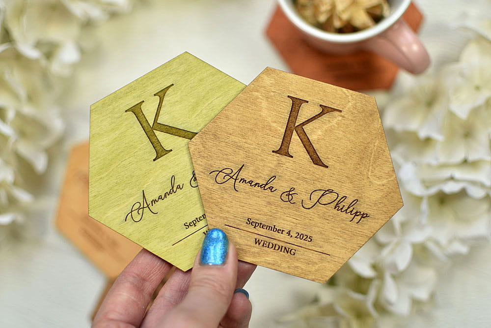 eleganckie podkładki pod kubki w kształcie heksagonu, minimalistyczny wzór z monogramem