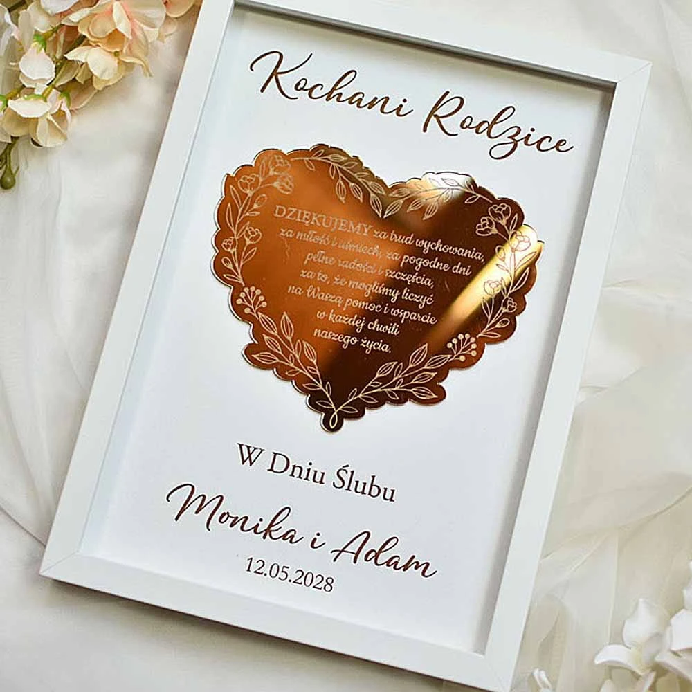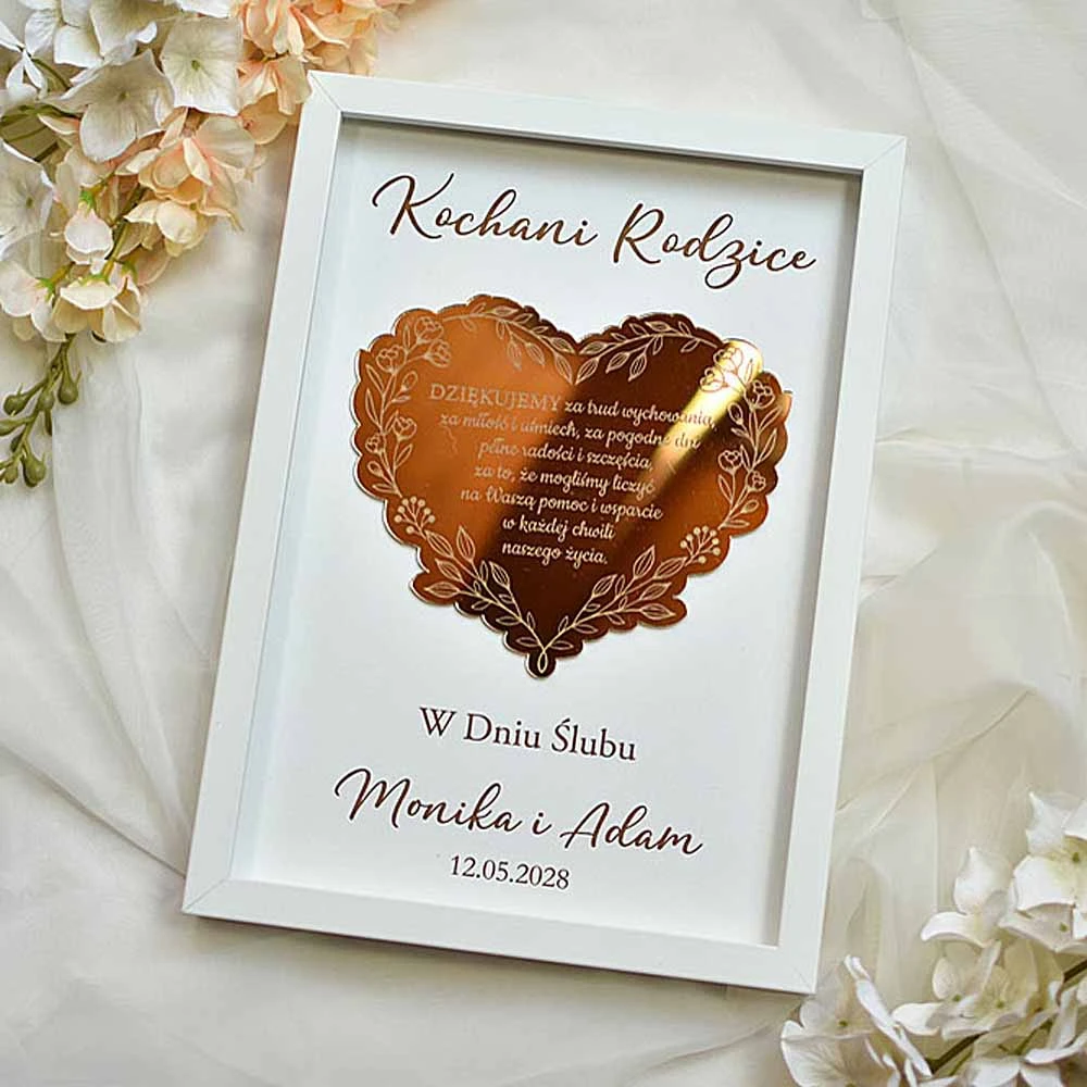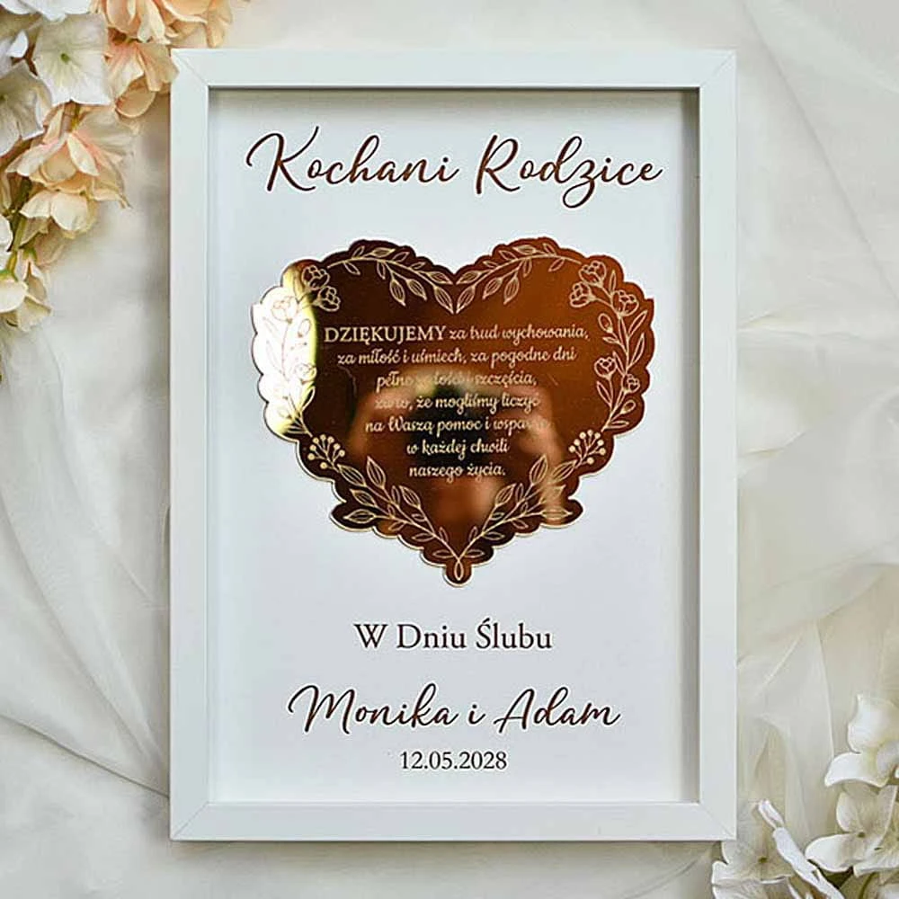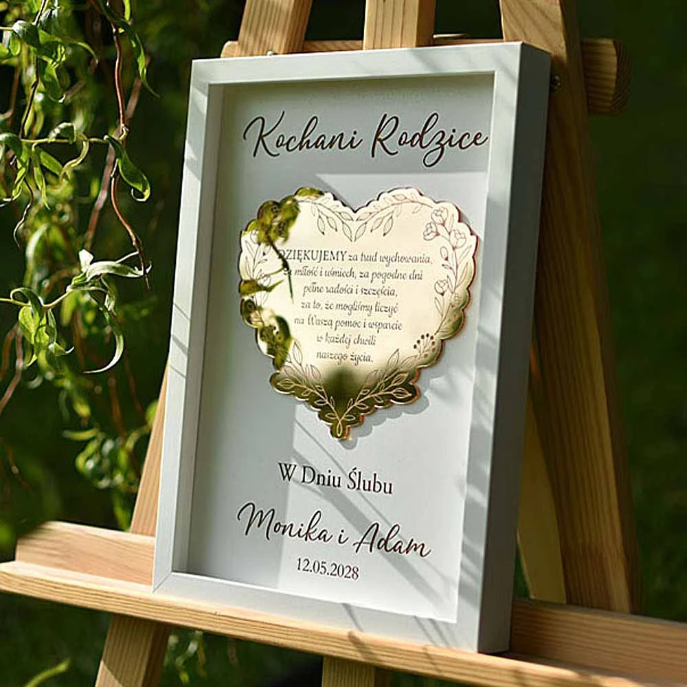 Szukacie eleganckiego podziękowania dla Rodziców na weselu? Podarujcie im wspaniały prezent w postaci obrazu, ozdobionego złotym, lustrzanym sercem z wygrawerowanym tekstem podziękowania. Serce pięknie się mieni w świetle, co dodatkowo zachwyca obdarowywanych. Tekst jest dowolny i możesz podziękowanie dostosować do Chrzestnych, Babci, Dziadka albo do dowolnej innej osoby lub do innej uroczystości. Obraz można podarować także nauczycielowi na zakończenie roku szkolnego albo Mamie na Dzień Matki czy nawet koleżance odchodzącej z pracy.