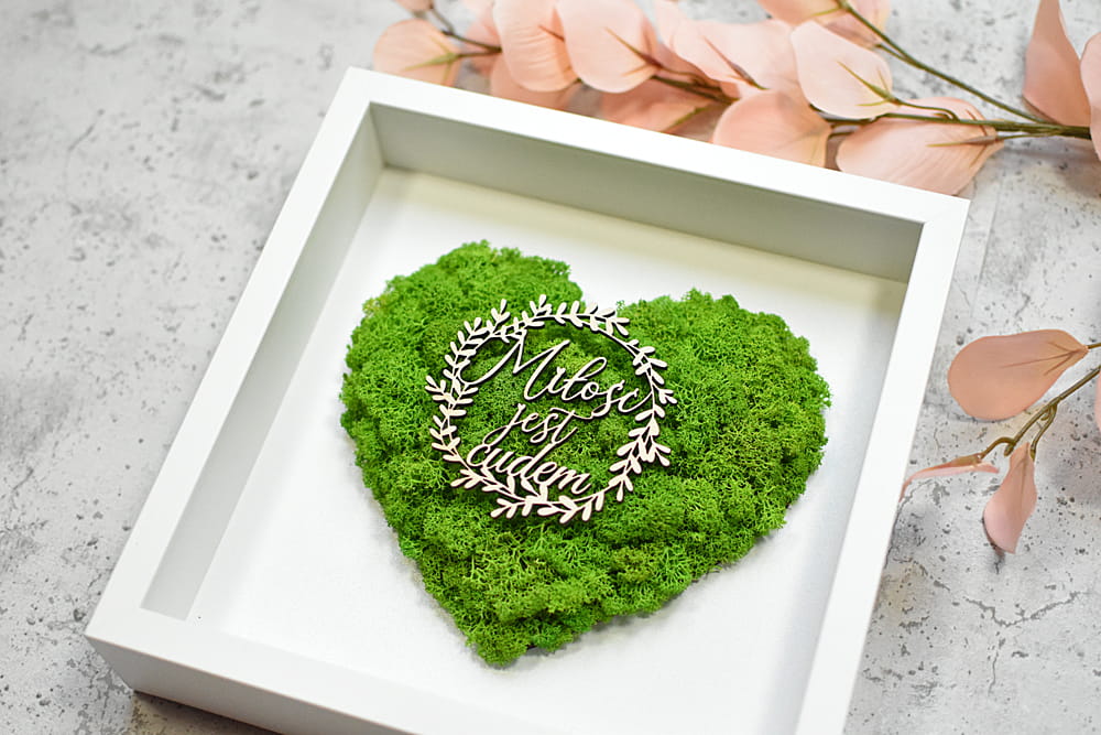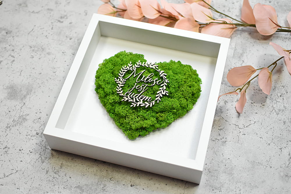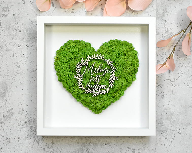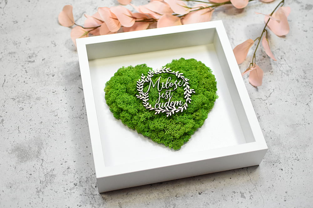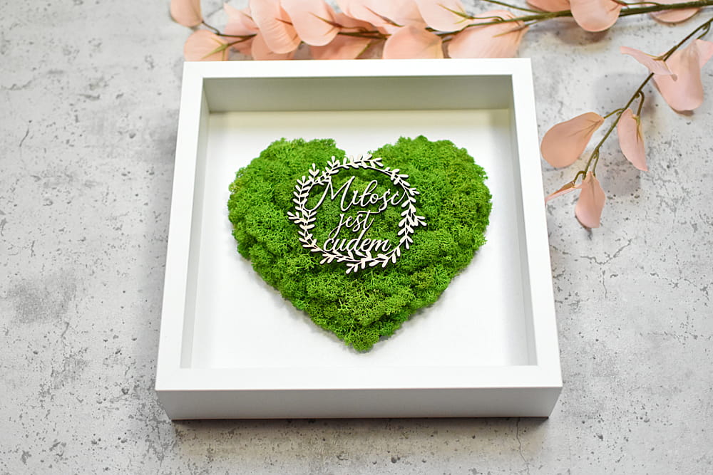 pomysł na prezent na ślub, na parapetówkę, rocznicę, ramka z sercem z mchu ozdobiona wiankiem