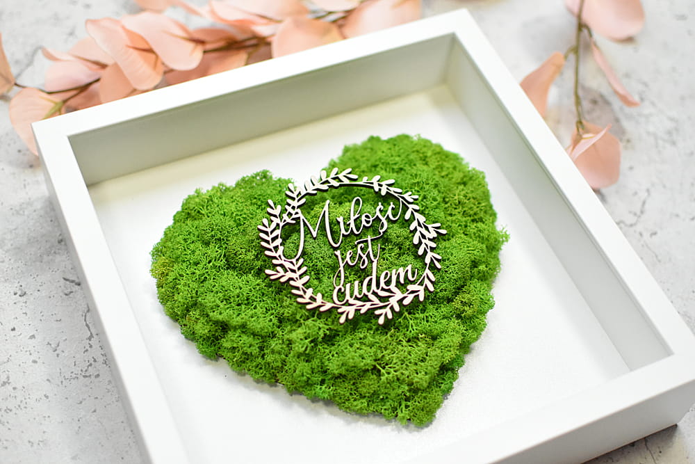 Bardzo elegancki prezent ślubny dla Państwa Młodych - przestrzenny obraz z sercem z naturalnego mchu chrobotka ze Skandynawii ozdobiony wiankiem z napisem "Miłość jest Słodka". Obraz będzie się pięknie prezentował na ścianie i zostanie na długie lata wspaniała pamiątką ślubnej uroczystości. Obraz można powiesić na ścianie lub postawić na biurku dzięki bardzo głębokiej ramce, z tyłu także znajduje się rozkładana nóżka.