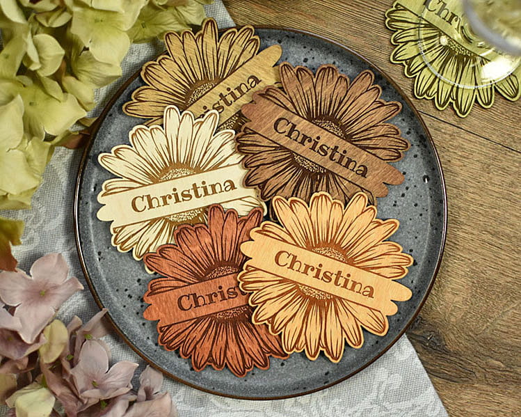 Podstawka pod kubek, filiżankę, kieliszek. Pomysł na niecodzienny upominek. Na środku można wygrawerować imię lub inny napis. W zależności od okazji podkładki można dostosować do różnych uroczystości jak wesele, urodziny, Chrzest, Komunia Święta czy rocznica. Na podkładce można umieścić także logo firmy.