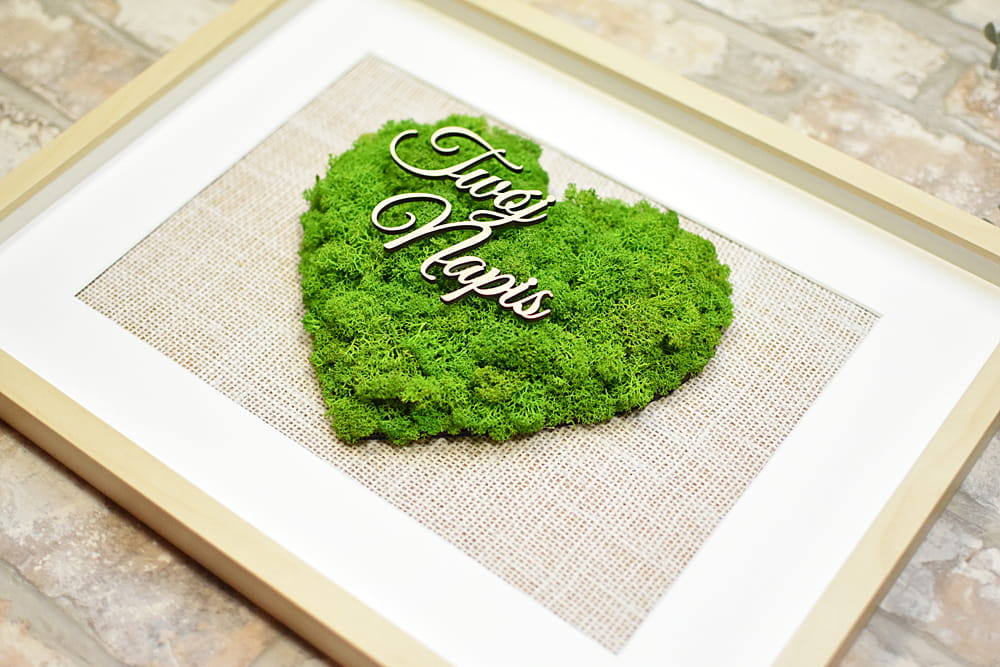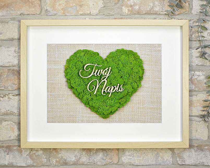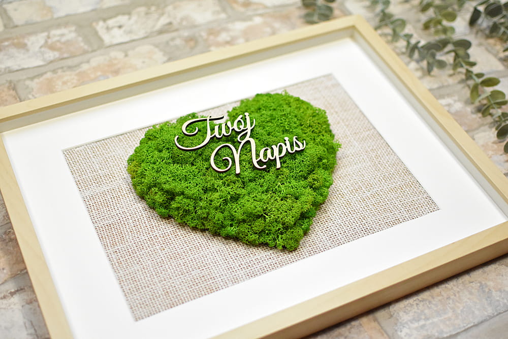 Elegancki, przestrzenny obraz ozdobiony sercem z naturalnego mchu chrobotka ze Skandynawii. Możesz podać własny napis i dostosować obraz do dowolnej okazji jak Dzień Kobiet, prezent ślubny, urodziny, jubileusz, podziękowanie dla rodziców, parapetówka, Walentynki, Dzień Nauczyciela, pożegnanie koleżanki w pracy, pożegnanie emeryta, Dzień Babci i Dziadka, 50-lecie ślubu, prezent na święta Bożego Narodzenia, prezent dla szefa czy po prostu naturalna dekoracja Twojej ściany.