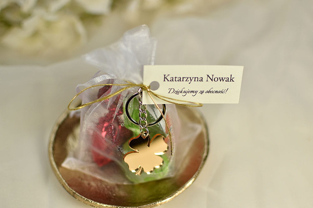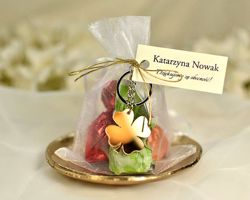 2w1! Winietka i podziękowanie dla gości za przybycie - zestaw pralinek w satynowym woreczku i lustrzany breloczek koniczynka.