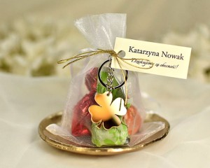Pomysł na słodki upominek dla gości - pralinki od polskiego producenta zapakowane w elegancki woreczek z organzy. W zależności od wersji do woreczka może być dowiązany personalizowany bilecik z Twoim tekstem, a nawet pamiątkowy breloczek. Na bileciku lub na breloczku może zostać umieszczone imię gościa, dzięki czemu upominek będzie jednocześnie pełnił rolę winietki. Taki elegancki podarunek będzie się świetnie prezentował położony obok talerza.