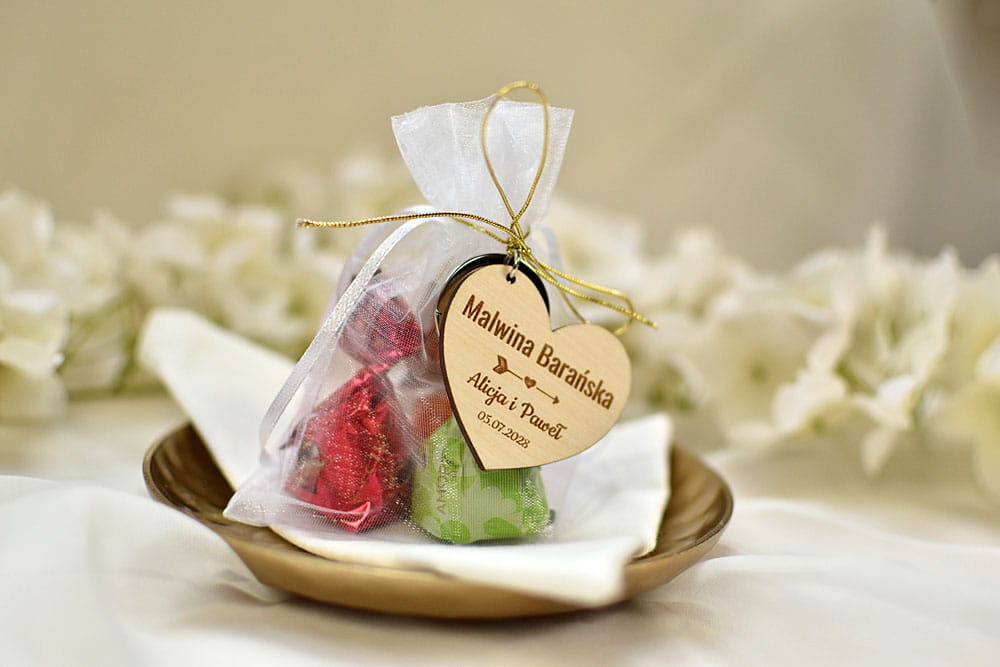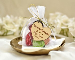 Pomysł na słodki upominek dla gości - pralinki od polskiego producenta zapakowane w elegancki woreczek z organzy. W zależności od wersji do woreczka może być dowiązany personalizowany bilecik z Twoim tekstem, a nawet pamiątkowy breloczek. Na bileciku lub na breloczku może zostać umieszczone imię gościa, dzięki czemu upominek będzie jednocześnie pełnił rolę winietki. Taki elegancki podarunek będzie się świetnie prezentował położony obok talerza.