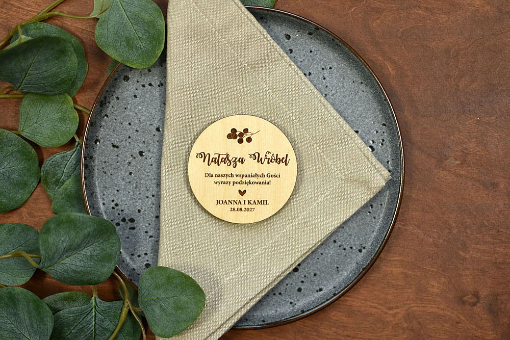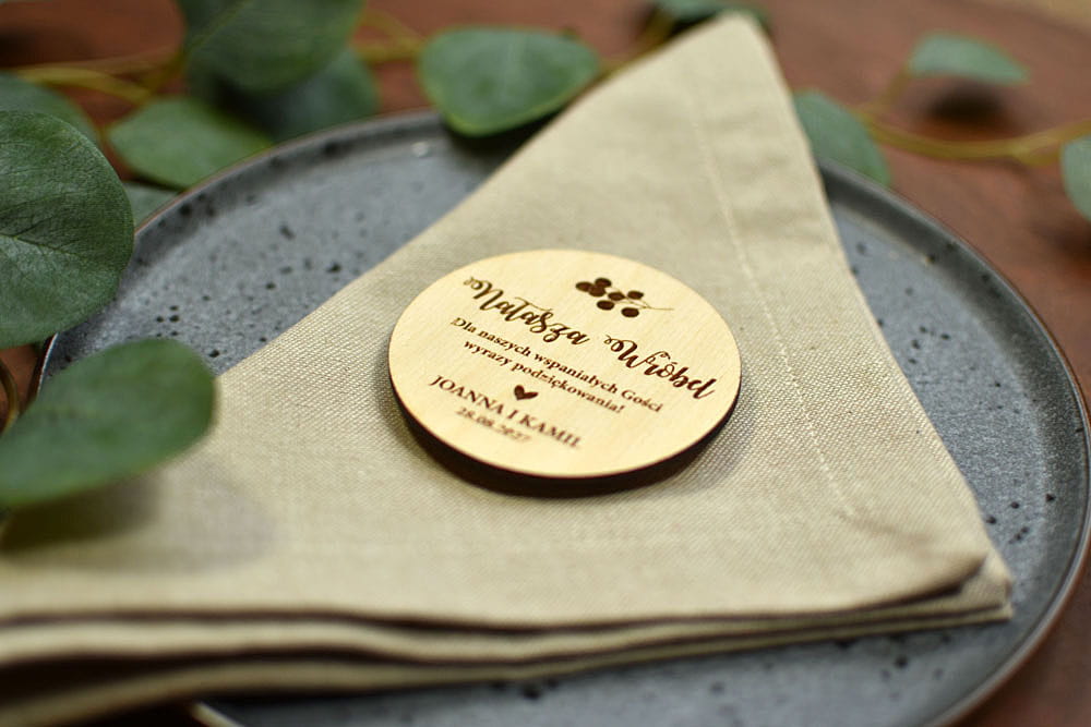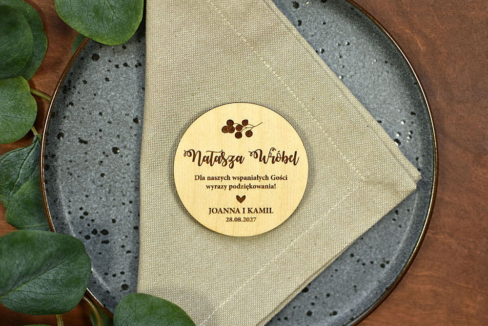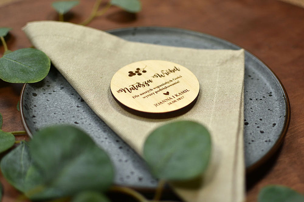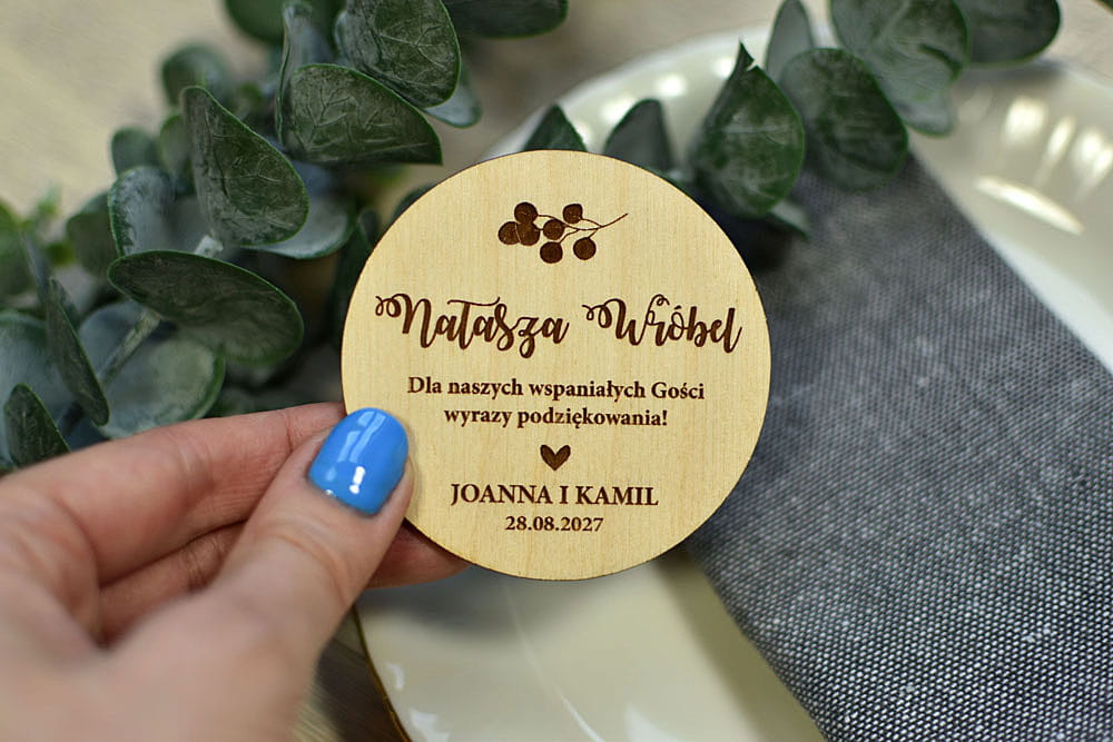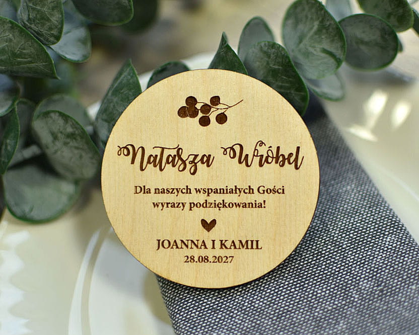 Taka drewniana winietka to świetny pomysł na prezent. Najpierw na imprezie goście łatwo znajdą swoje miejsca, a później magnesiki będą piękną pamiątką, która zostanie z nimi na lata. Winietki są wykonane z naturalnego drewna, na którym mogą niekiedy pojawiać się przebarwienia czy sęki, co nadaje produktowi charakteru i niepowtarzalności.