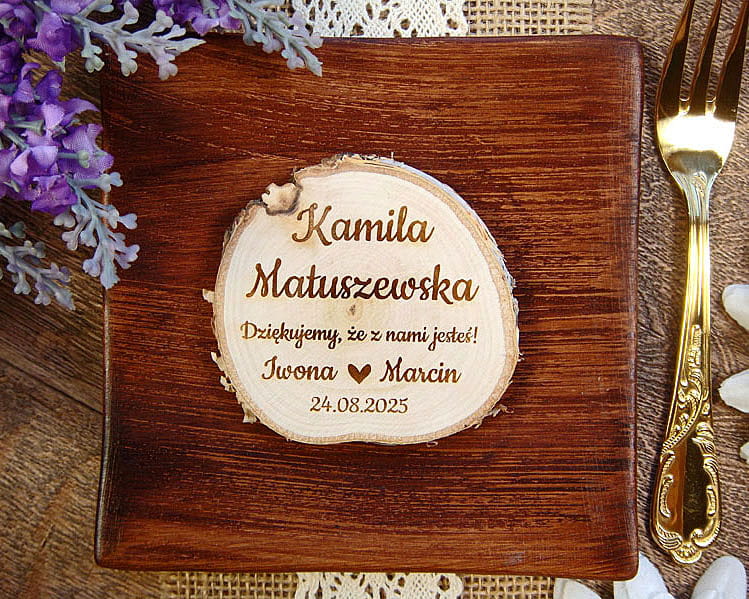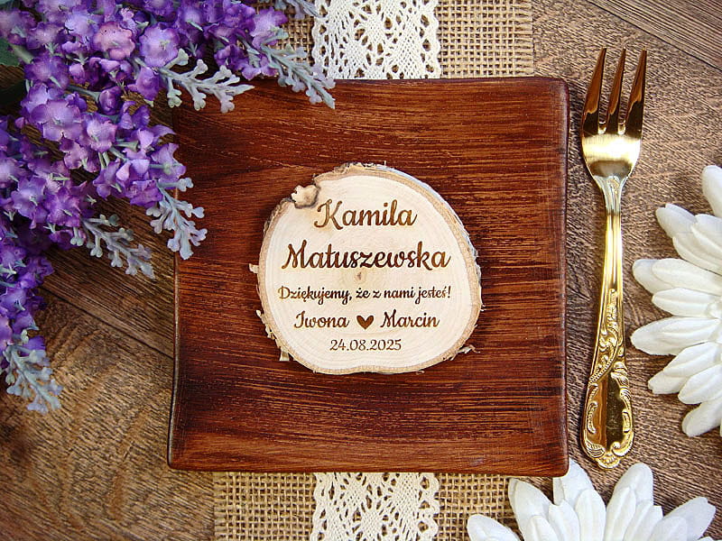 Świetny pomysł na prezent dla gości - czyli winietka i upominek w jednym i to w postaci magnesu na lodówkę. Na weselu lub innej uroczystości goście łatwo znajdą swoje miejsca, a później magnesiki będą piękną pamiątką, która zostanie z nimi na lata. Winietki są wykonane z plastrów drewna brzozowego, na których mogą niekiedy pojawiać się przebarwienia czy sęki, co nadaje winietce charakteru i niepowtarzalności.