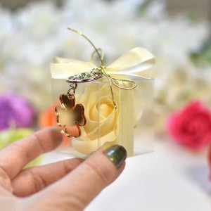Drobny upominek dla gości - róża mydlana w pudełeczku z breloczkiem koniczynką na szczęście.