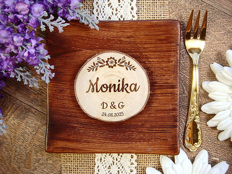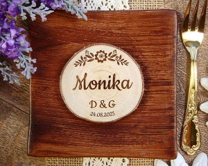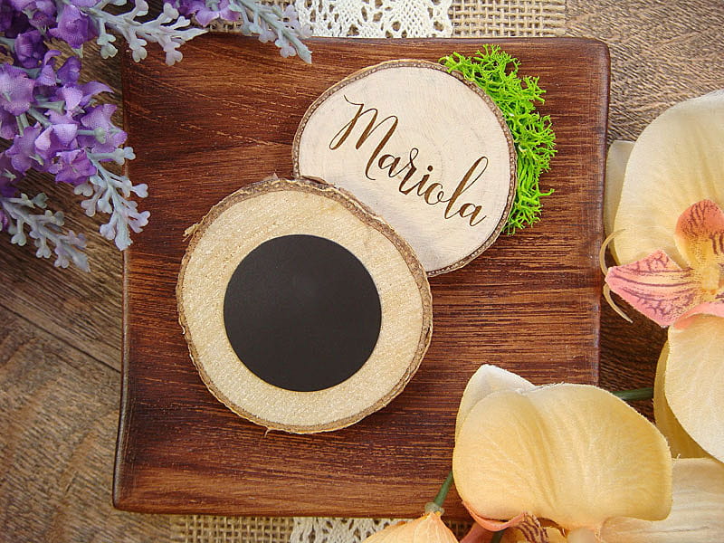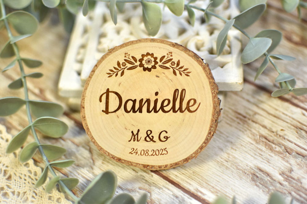 Świetny pomysł na prezent dla gości - czyli winietka i upominek w jednym i to w postaci magnesu na lodówkę. Na weselu lub innej uroczystości goście łatwo znajdą swoje miejsca, a później magnesiki będą piękną pamiątką, która zostanie z nimi na lata. Winietki są wykonane z plastrów drewna brzozowego, na których mogą niekiedy pojawiać się przebarwienia czy sęki, co nadaje winietce charakteru i niepowtarzalności.