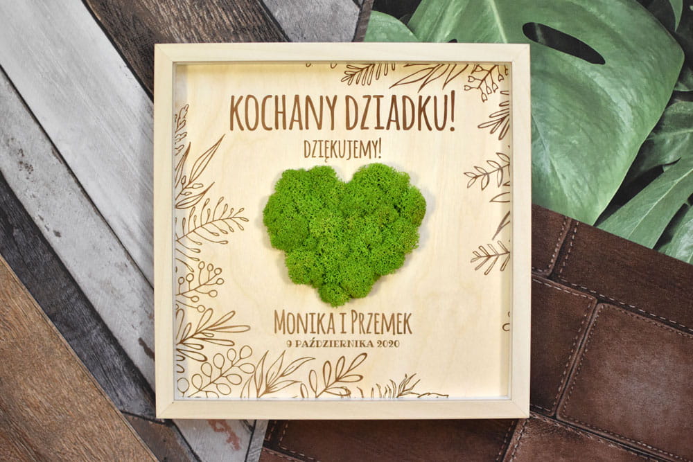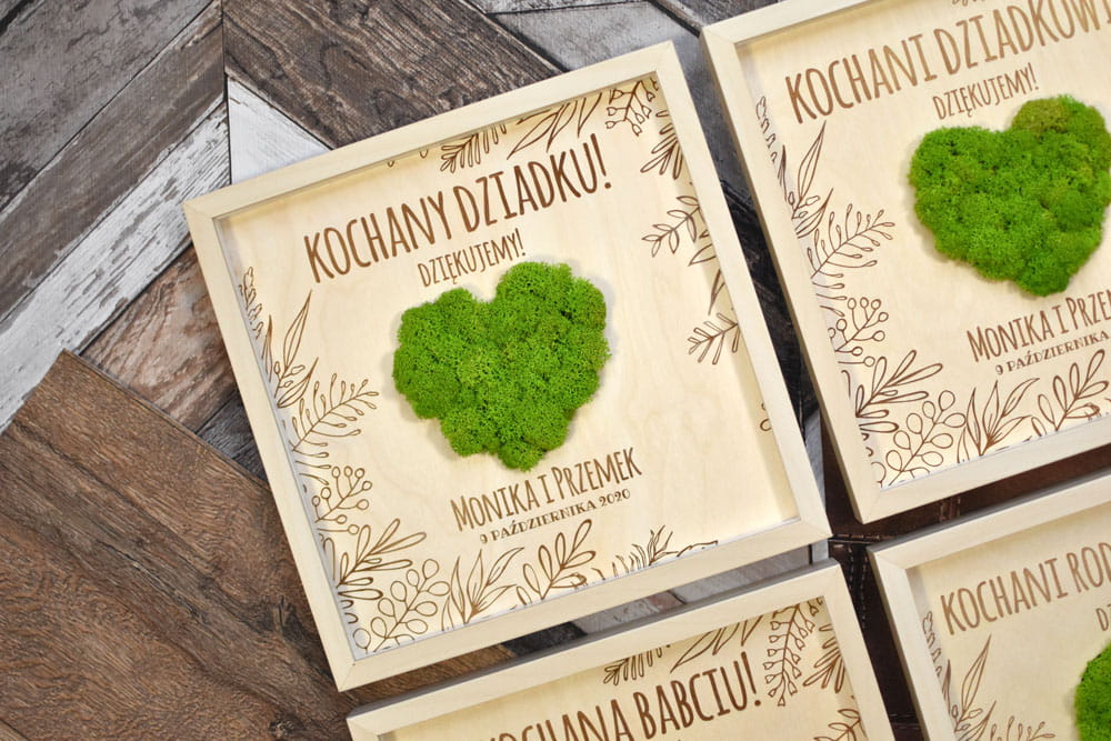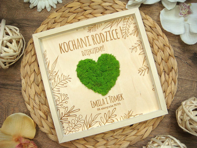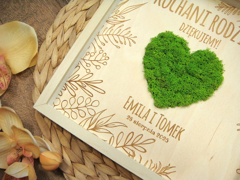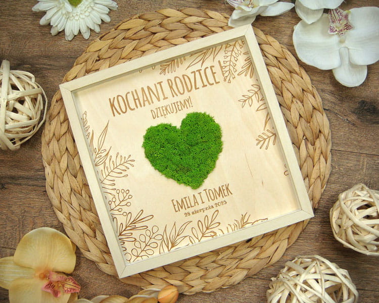 Pomysł na prezent dla Rodziców na weselu lub z innej okazji. Przestrzenny obraz wykonany z naturalnych materiałów - w środku znajduje się zielone serce z mchu chrobotka ze Skandynawii, a naokoło wygrawerowane w brzozowej sklejce wzory i napisy. Obraz można powiesić na ścianie lub postawić na biurku - z tyłu znajduje się rozkładana nóżka. W zależności od treści napisu obraz można podarować mamie z okazji Dnia Matki, Babci, ulubionej nauczycielce z okazji Dnia Nauczyciela czy jako prezent dla Rodziców np. z okazji Złotych Godów.