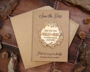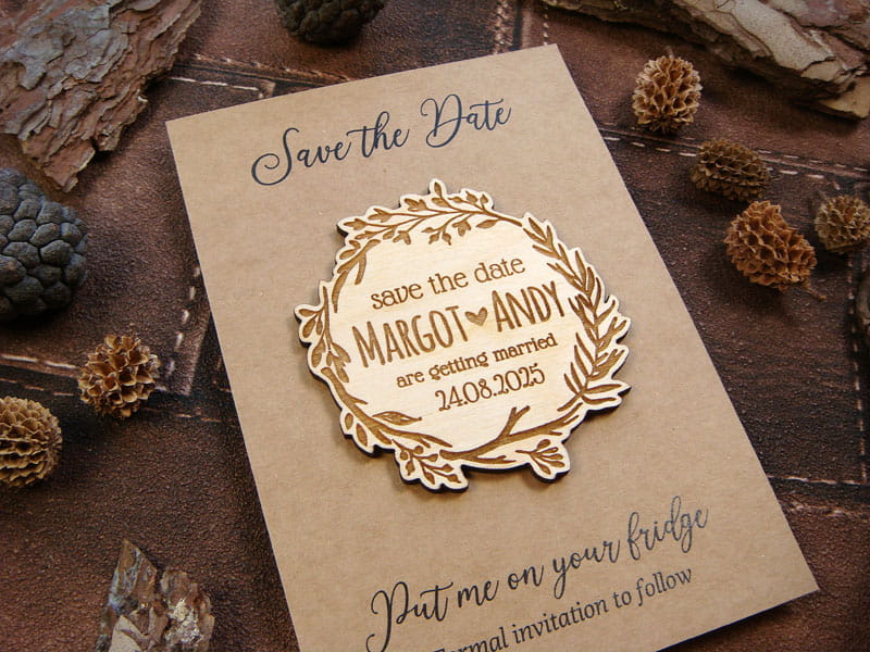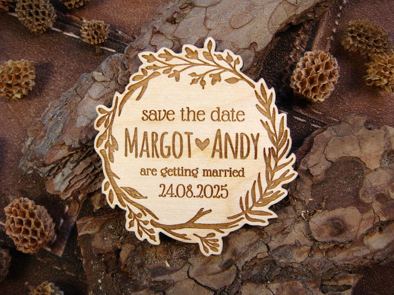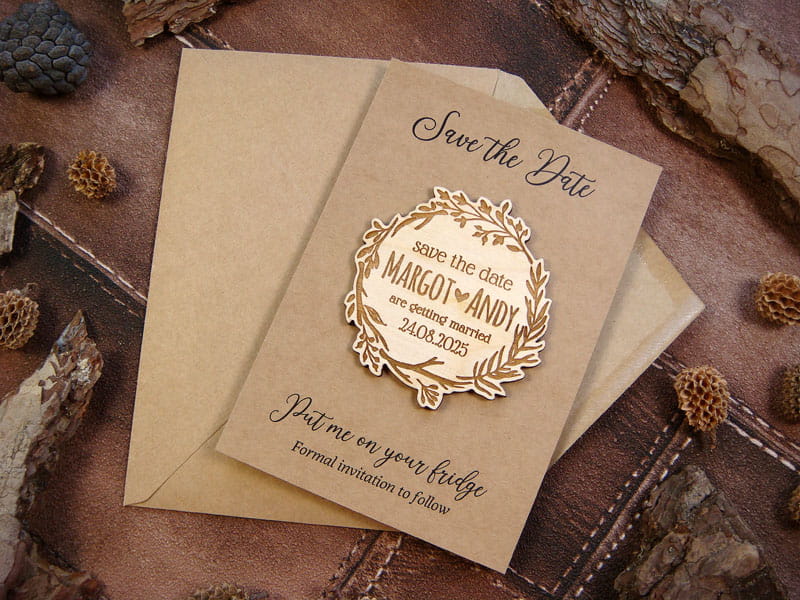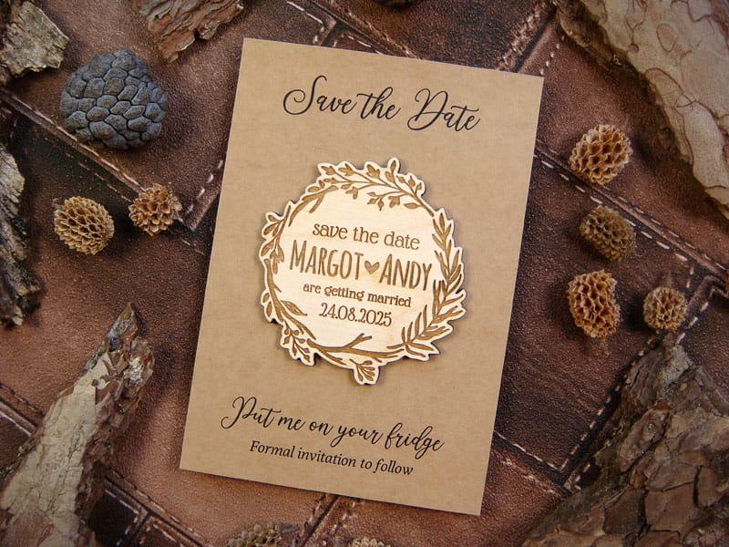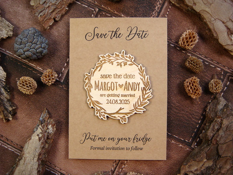 Chcecie uprzedzić gości, żeby zarezerwowali czas na Wasz ślub za kilka miesięcy? Wyślijcie im Save the Date w postaci drewnianego magnesu na lodówkę. Jest możliwość domówienia kartki z nadrukiem i koperty jak na załączonych zdjęciach. Wszystkie napisy mogą być w języku polskim. Magnesy są wykonane z naturalnego drewna, na którym mogą niekiedy pojawiać się przebarwienia czy sęki, co nadaje produktowi charakteru i niepowtarzalności.