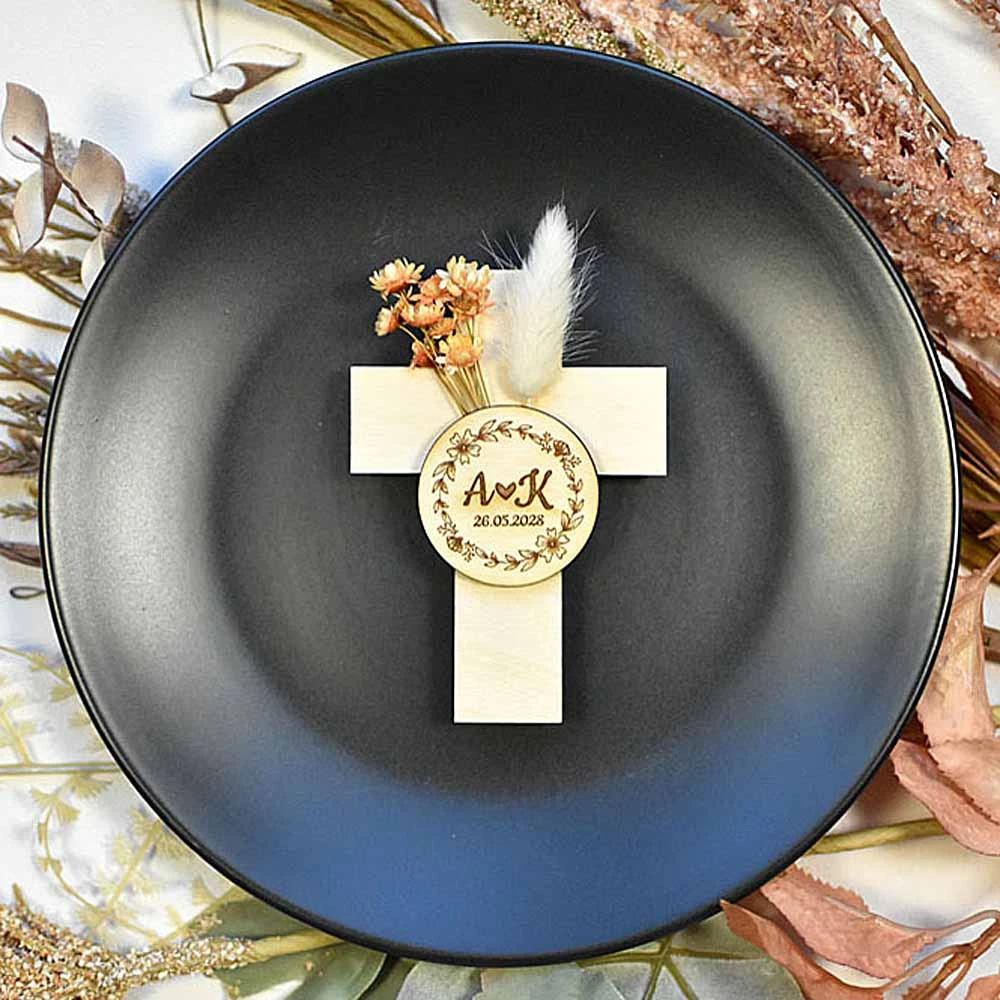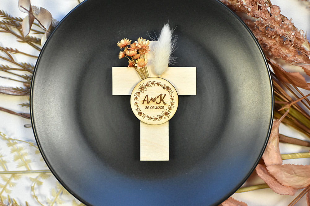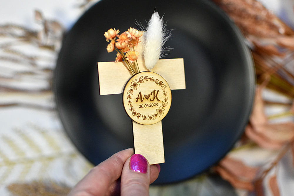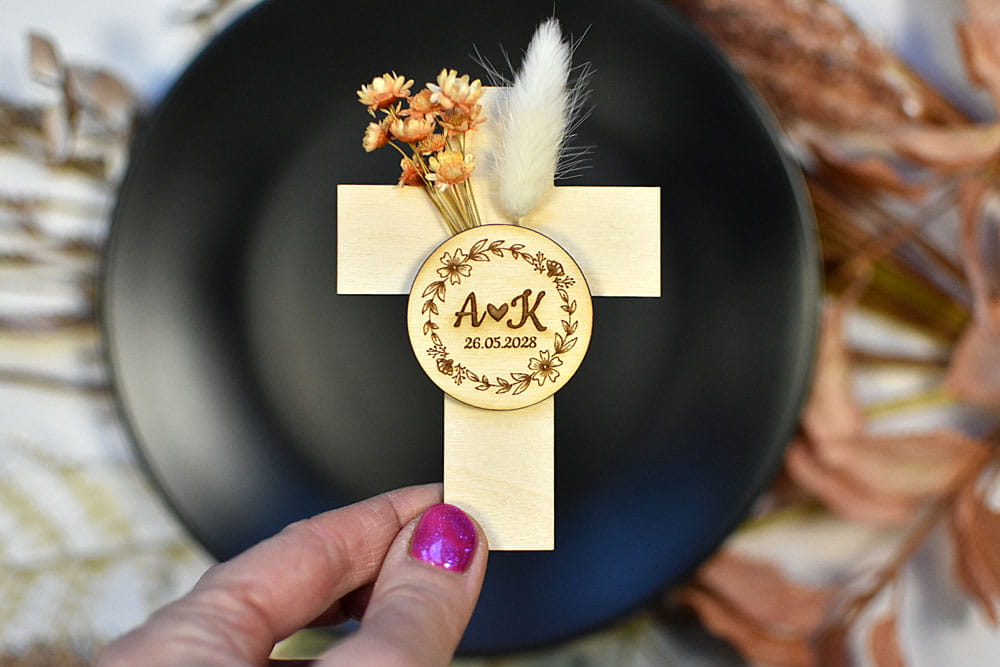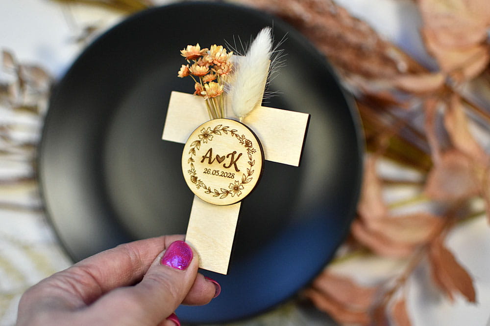 Dla wszystkich, którzy szukają upominków dla gości o charakterze religijnym - magnes na lodówkę w kształcie krzyża. Magnes jest dodatkowo ozdobiony suszonymi kwiatami, co nawiązuje do stylu boho oraz rustykalnego. Na środku znajduje się okolicznościowa plakietka. W zależności od wzoru można na niej umieścić własny tekst. Magnesy można dostosować do każdej okazji jak Chrzest Święty, I Komunia Święta, ślub, rocznica, urodziny itp.