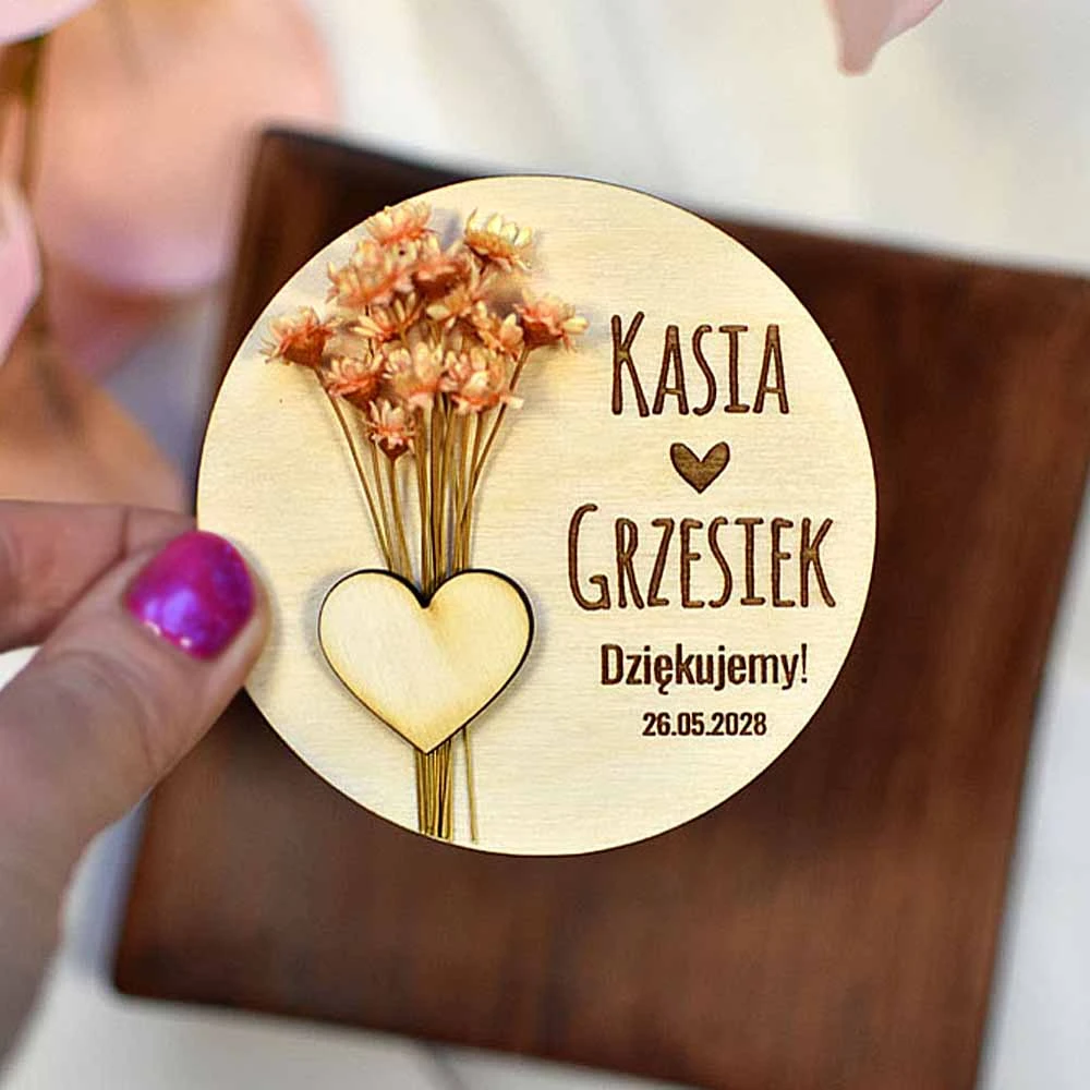 Przepiękny magnes na lodówkę z suszonymi kwiatami - wyjątkowy prezent dla Waszych gości. Magnes będzie świetnie pasował do stylu boho uroczystości, jak i dekoracji rustykalnych czy wiejskich. Na magnesie znajduje się okolicznościowy napis, ale można go zmienić i dostosować do każdej okazji jak Chrzest Święty, I Komunia Święta, ślub, rocznica, urodziny, prezent dla nauczycieli na zakończenie roku szkolnego czy eko gadżet firmowy dla klientów itp.