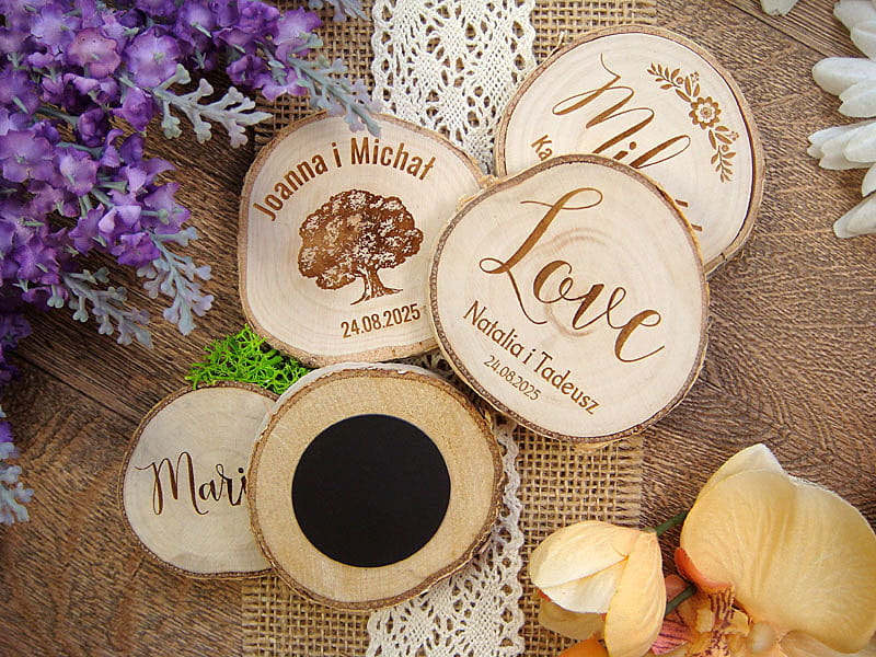 magnesy na lodówkę z plastrów drewna, prezent dla gości na weselu PLM3