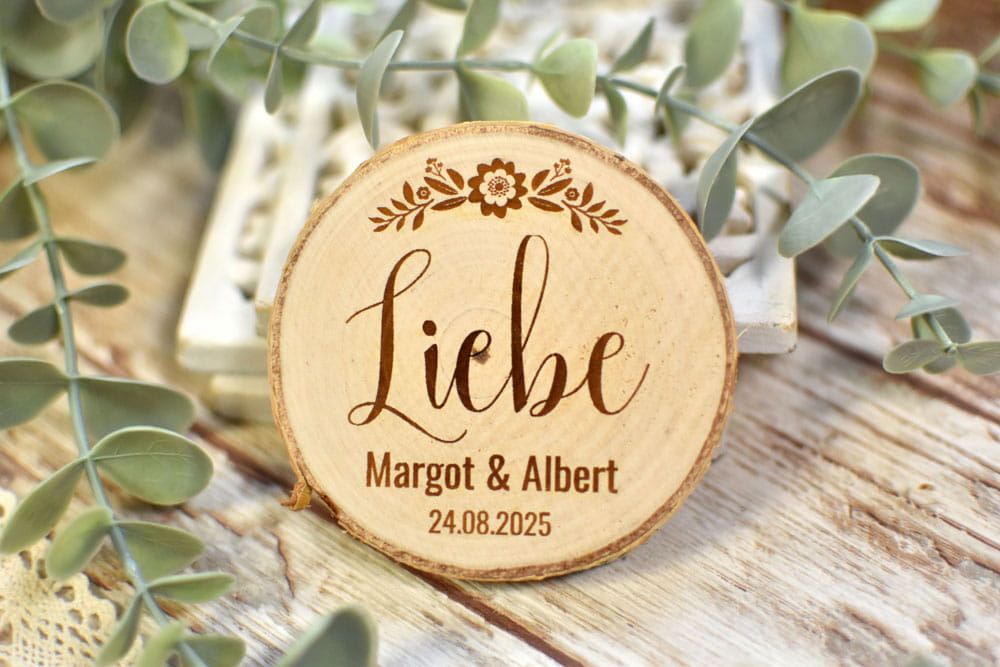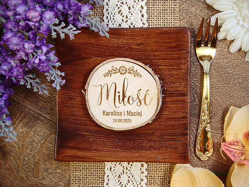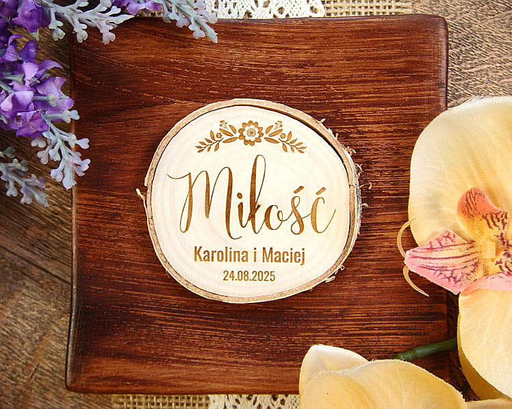Świetny pomysł na prezent dla gości - grawerowany plaster drewna w postaci magnesu na lodówkę. Upominek na każdą okazję - napisy dowolne.