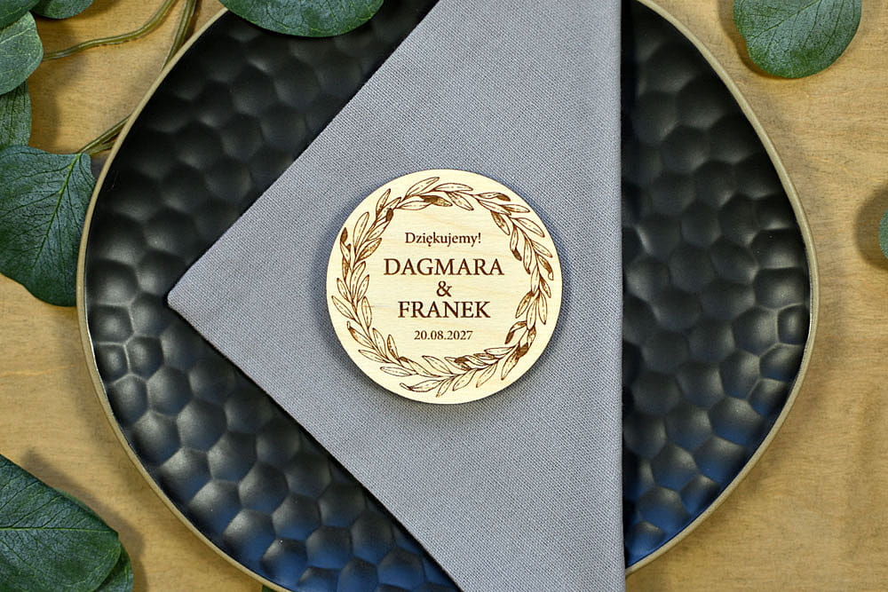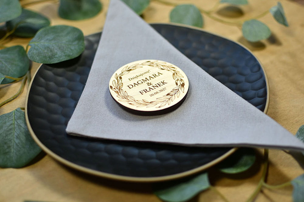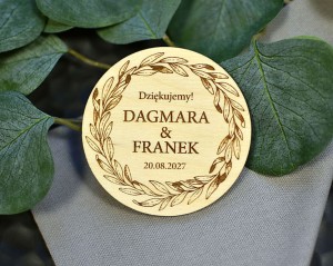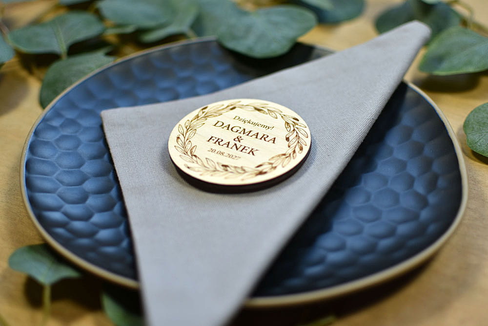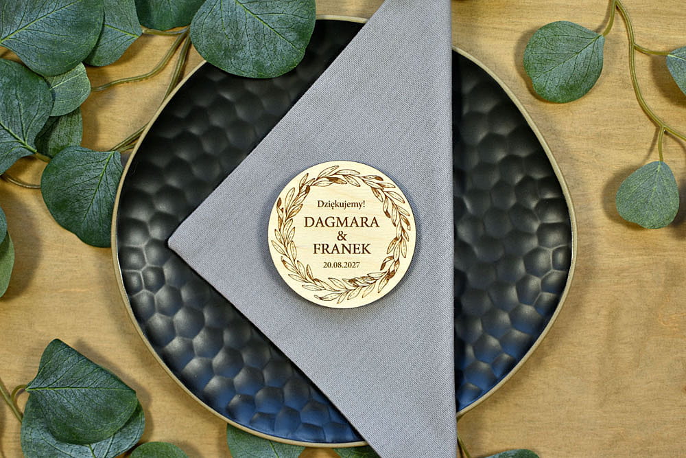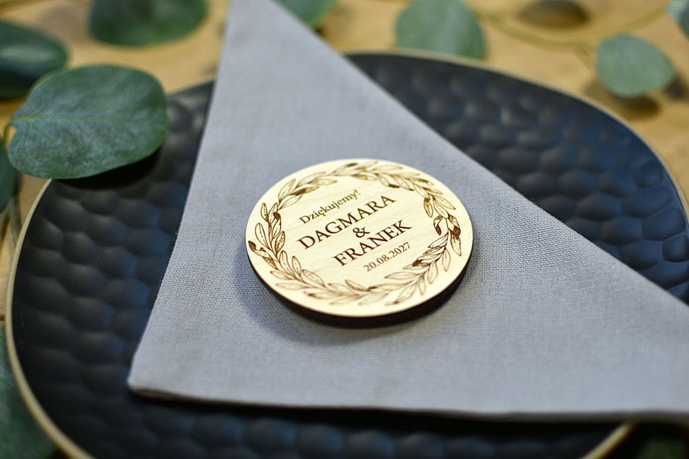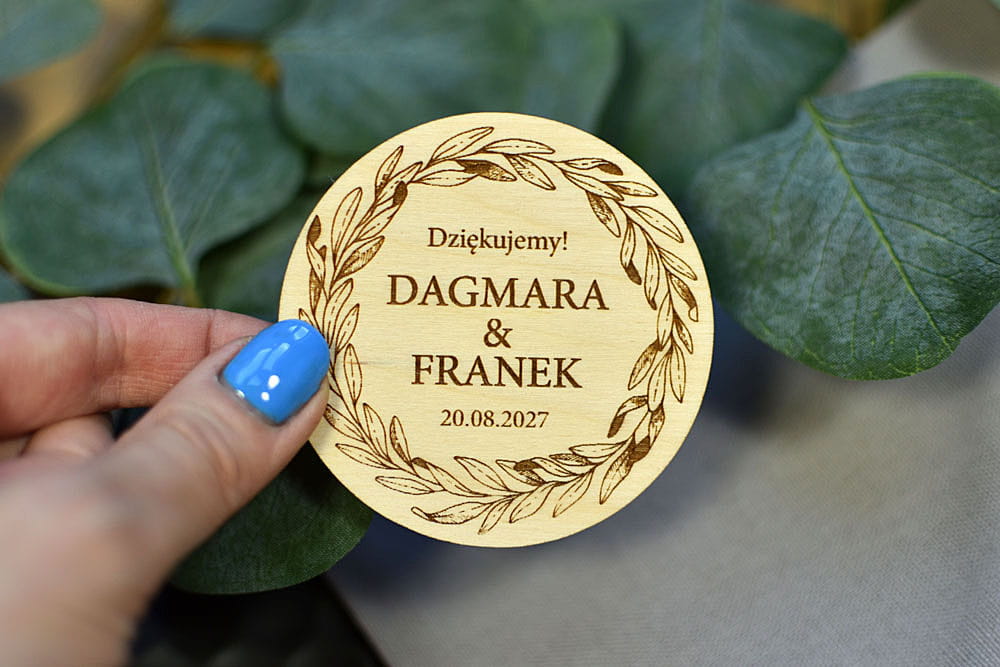 Grawerowane, drewniane magnesy na lodówkę - idealny prezent, który przez lata będzie przypominał gościom o Waszej uroczystości. Magnesy są wykonane z naturalnego drewna, na którym mogą niekiedy pojawiać się przebarwienia czy sęki, co nadaje produktowi charakteru i niepowtarzalności.