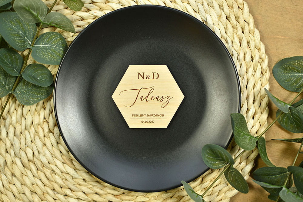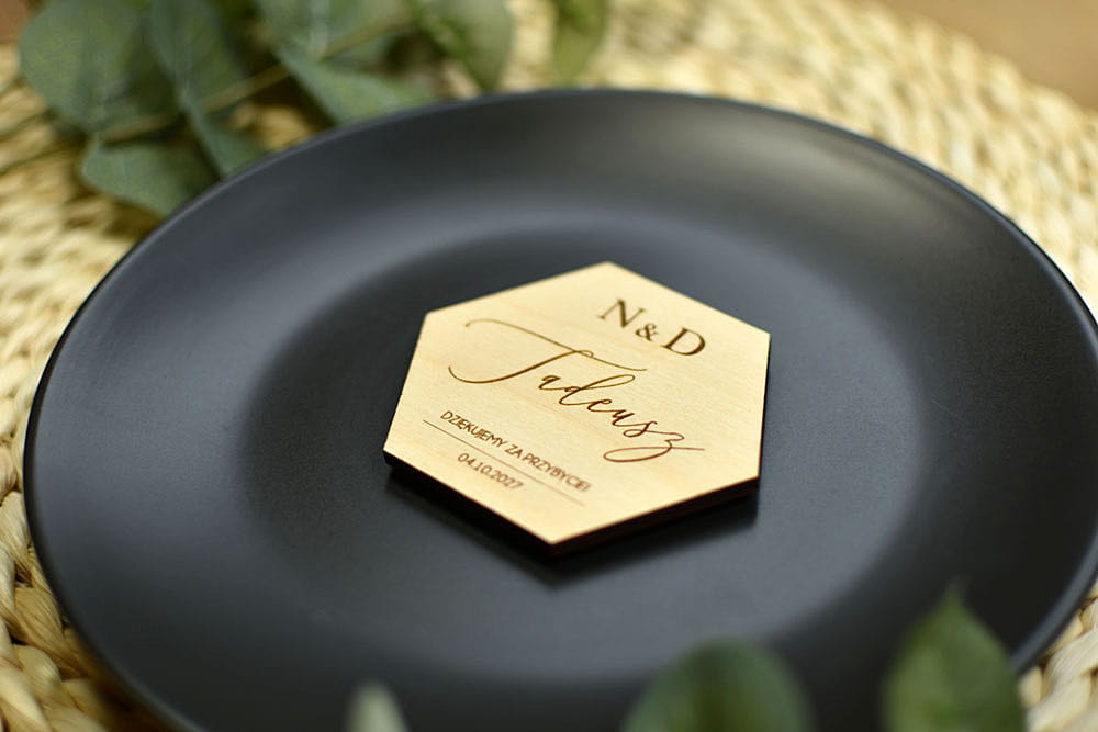 podziękowania ślubne dla gości i drewniana winietka heksagon WPH3