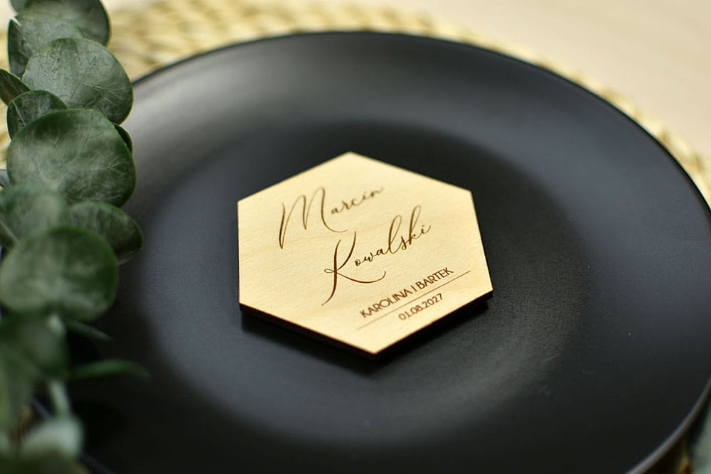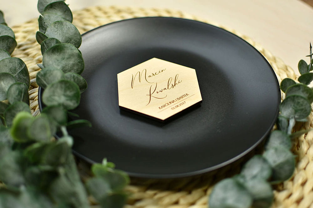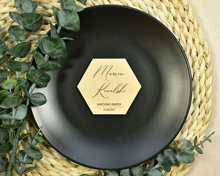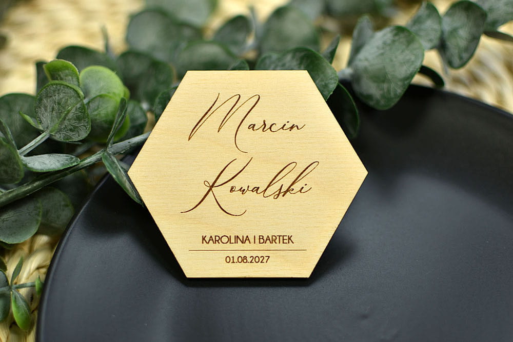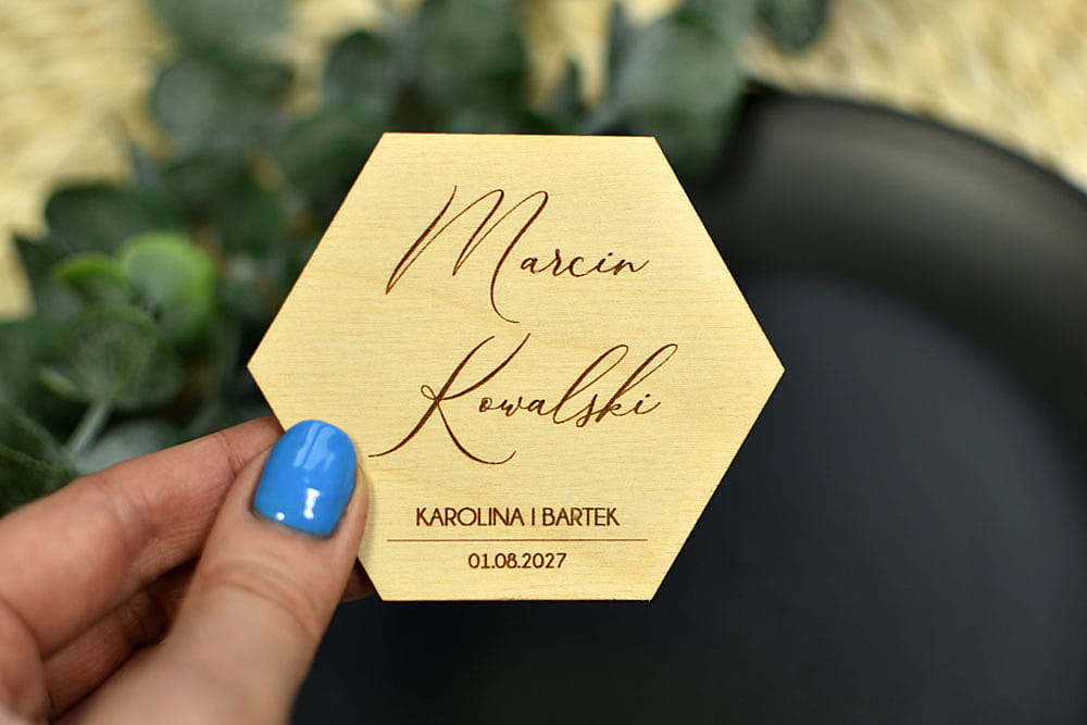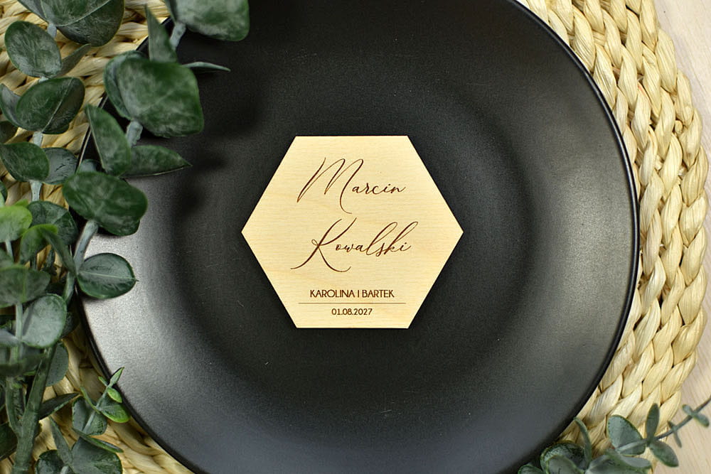 nowoczesna winietka heksagon i upominek dla gości weselnych z magnesem WPH2