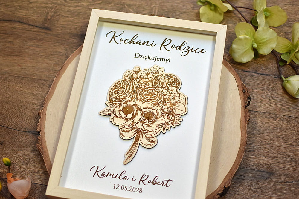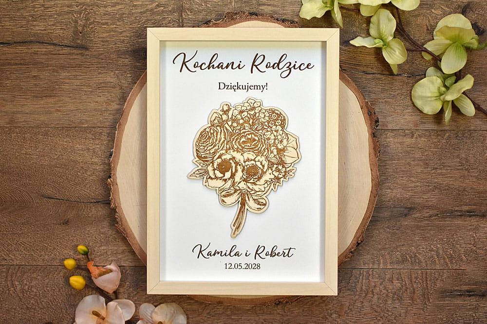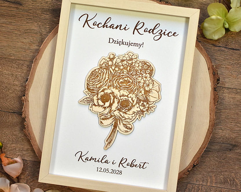 Obraz z drewnianym, grawerowanym bukietem kwiatów i Waszym napisem to jeden z pomysłów na prezent na podziękowania dla Rodziców, dla Mamy albo Babci. Zaskoczcie swoich bliskich gustowną pamiątką. Napisy są dowolne, możecie podać własny tekst. Obraz można dostosować także do innej okazji i podarować go koleżance odchodzącej z pracy.