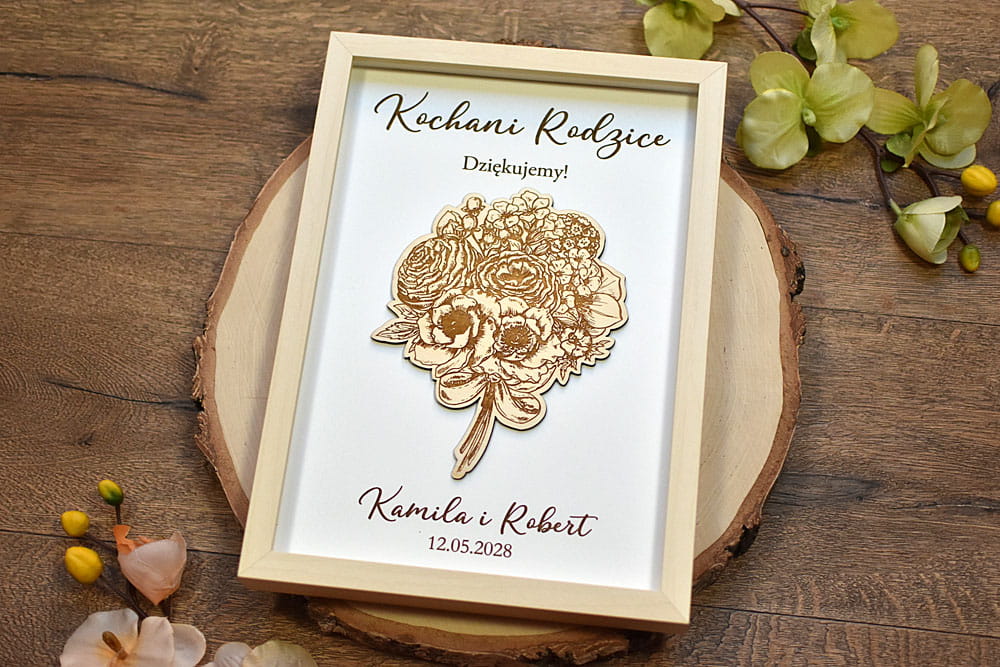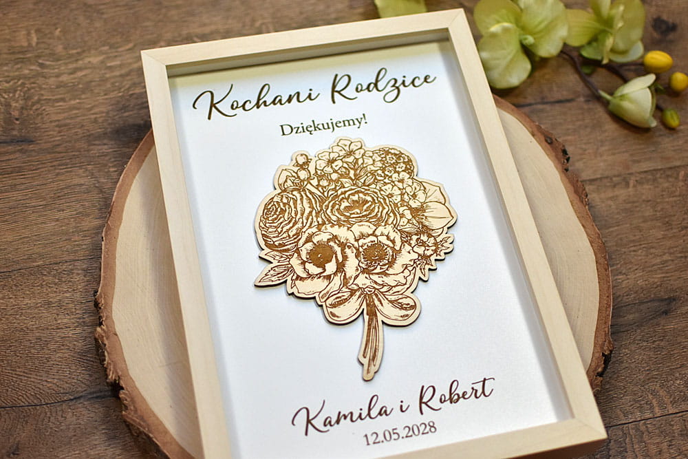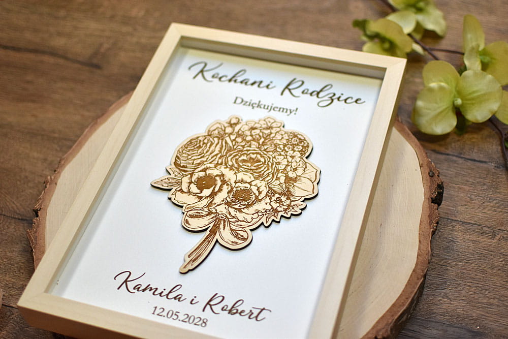 Szukacie nietypowego podziękowania dla Rodziców na weselu? Podarujcie im wspaniały prezent w postaci obrazu 3d, ozdobionego drewnianym, grawerowanym bukietem kwiatów i okolicznościowym napisem. Obraz można powiesić na ścianie lub postawić na biurku - z tyłu znajduje się rozkładana nóżka. W zależności od treści napisu obraz można podarować np. Mamie z okazji Dnia Matki, Babci, Dziadkom, Nauczycielowi czy ukochanej przyjaciółce, można także w dniu ślubu podziękować Rodzicom Chrzestnym.