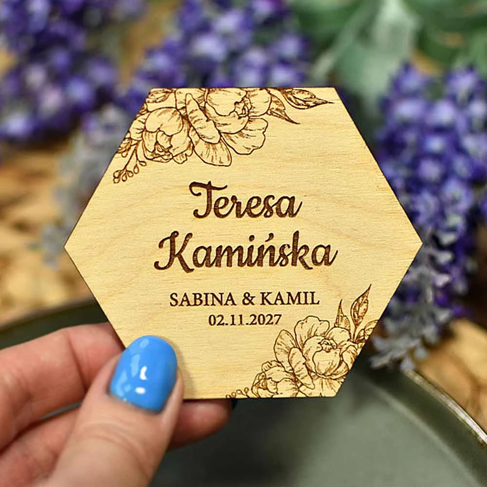 Taka drewniana winietka to świetny pomysł na prezent. Najpierw na imprezie goście łatwo znajdą swoje miejsca, a później magnesiki będą piękną pamiątką, która zostanie z nimi na lata. Winietki są wykonane z naturalnego drewna, na którym mogą niekiedy pojawiać się przebarwienia czy sęki, co nadaje produktowi charakteru i niepowtarzalności.
