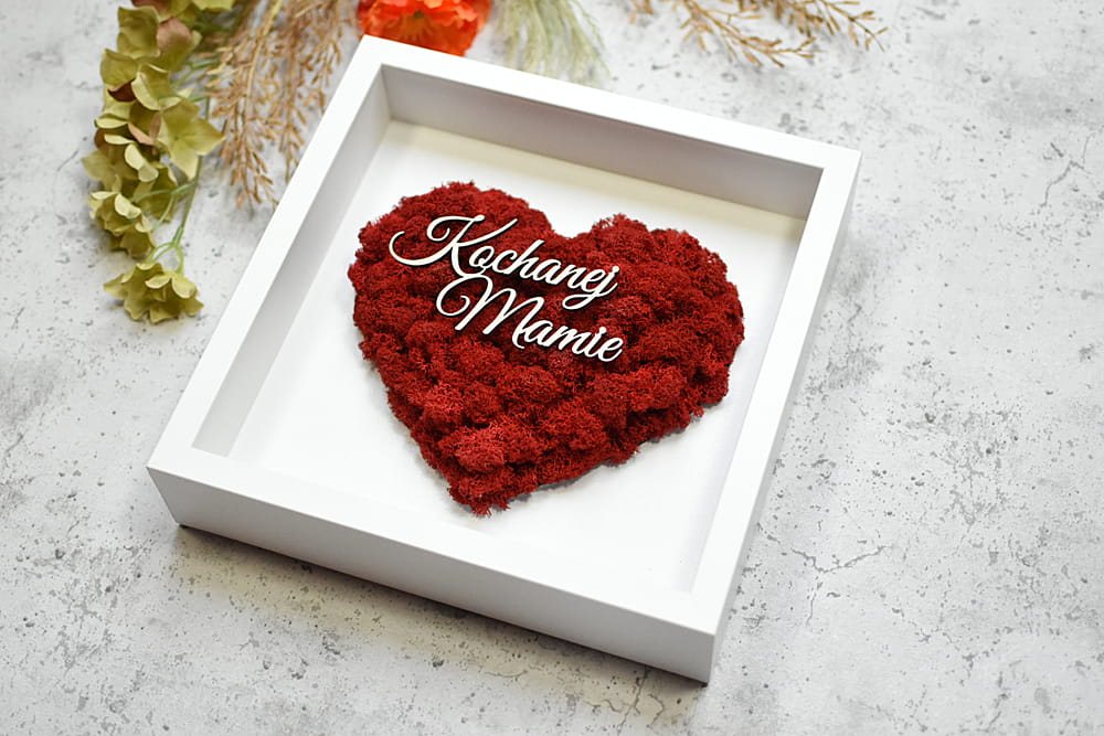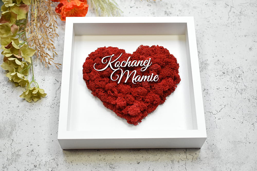 Oryginalny prezent dla Mamy, Taty, Chrzestnych - czerwone serce z mchu z napisem w ramce.