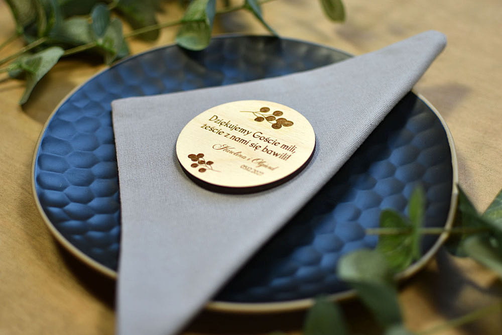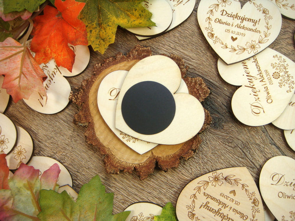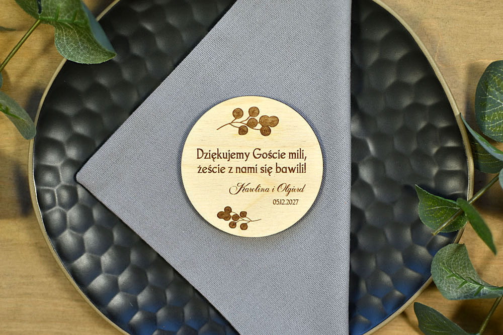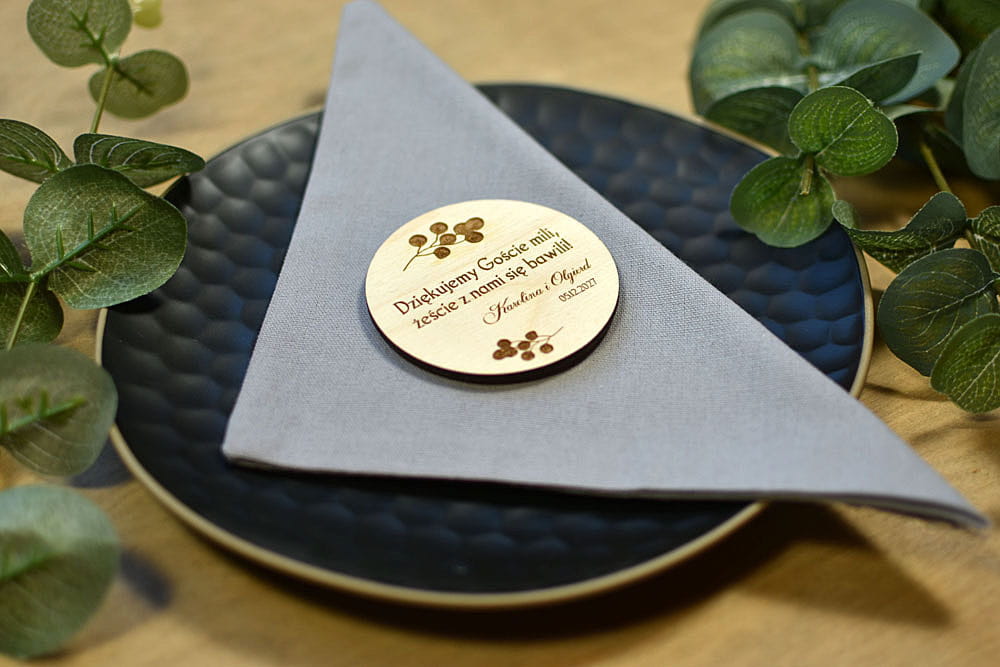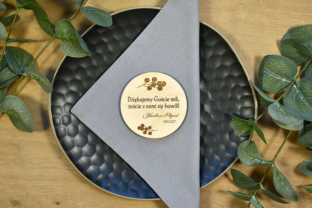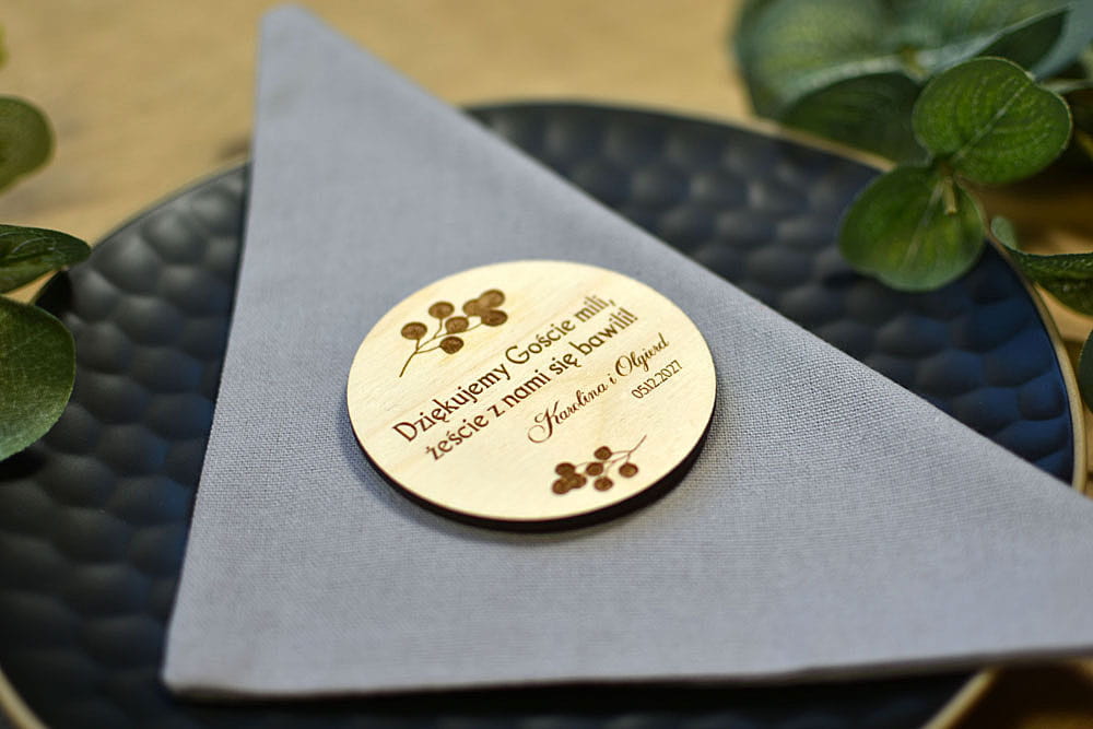 Grawerowane, drewniane magnesy na lodówkę - idealny prezent, który przez lata będzie przypominał gościom o Waszej uroczystości. Magnesy są wykonane z naturalnego drewna, na którym mogą niekiedy pojawiać się przebarwienia czy sęki, co nadaje produktowi charakteru i niepowtarzalności.