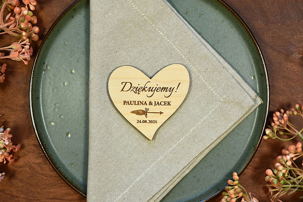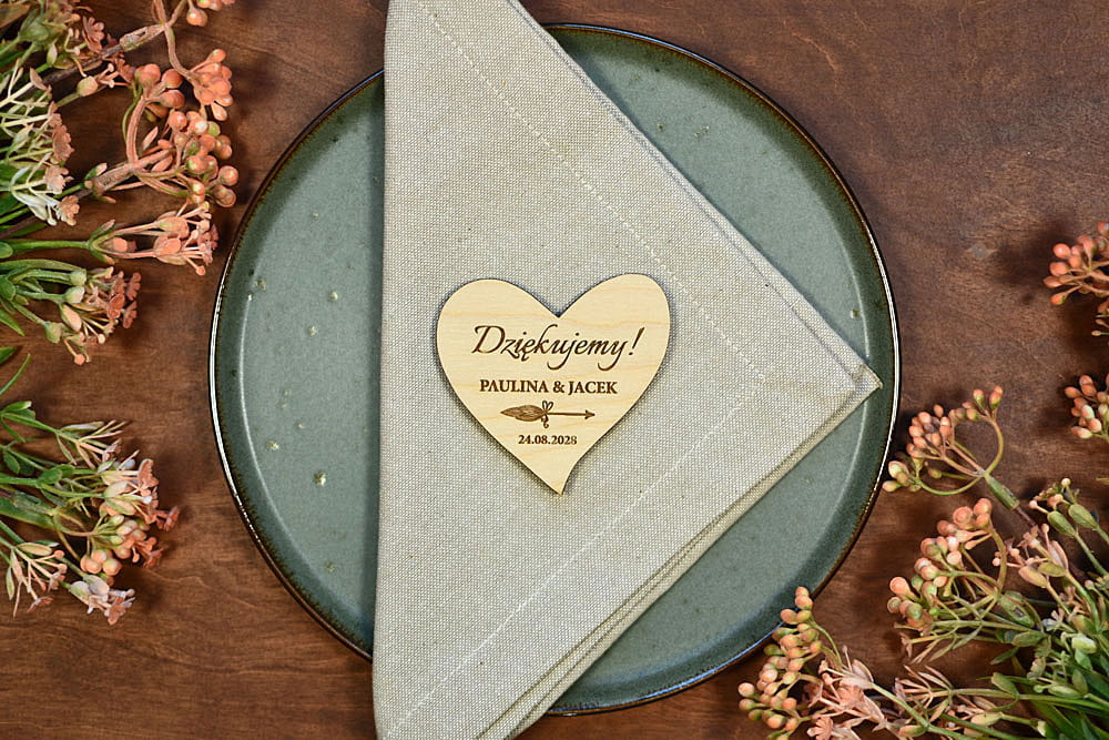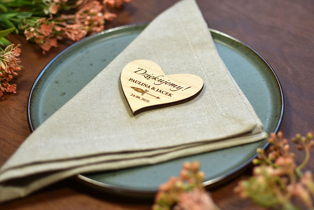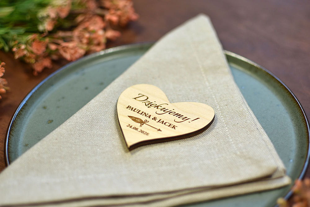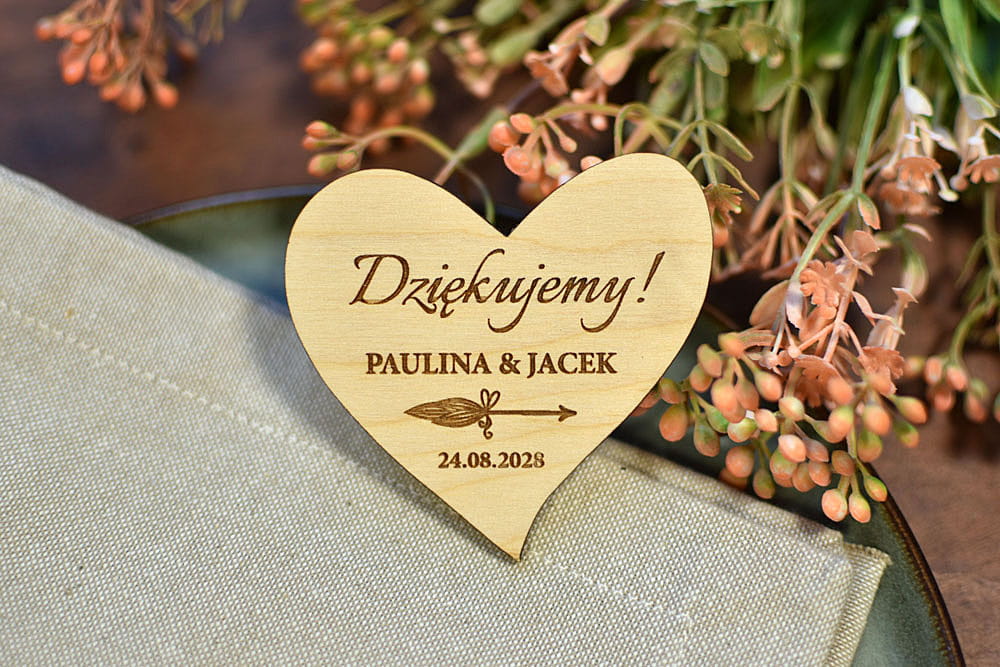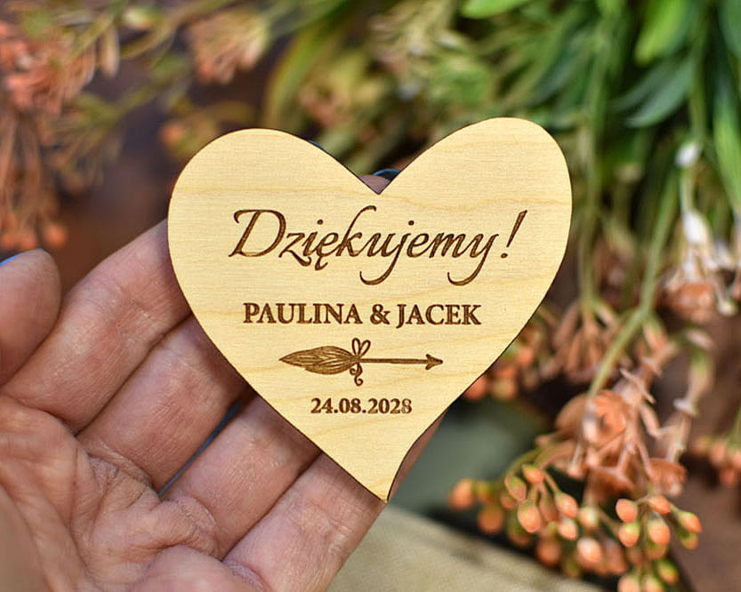 Grawerowane, drewniane magnesy na lodówkę - idealny prezent, który przez lata będzie przypominał gościom o Waszej uroczystości. Magnesy są wykonane z naturalnego drewna, na którym mogą niekiedy pojawiać się przebarwienia czy sęki, co nadaje produktowi charakteru i niepowtarzalności.