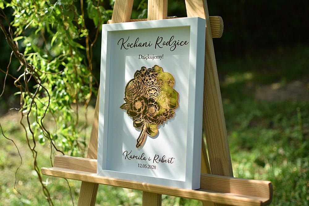 Szukacie efektownego podziękowania dla Rodziców od Młodej Pary? Podarujcie im obraz ozdobiony złotym, lustrzanym bukietem kwiatów w eleganckiej białej ramce. Bukiet pięknie się mieni w świetle, co dodatkowo zachwyca obdarowywanych. Tekst jest dowolny i możesz podziękowanie dostosować do Chrzestnych, Świadków, Babci, Dziadka albo do dowolnej innej osoby lub do innej uroczystości. Obraz można podarować także nauczycielowi na zakończenie roku szkolnego albo Mamie na Dzień Matki czy nawet koleżance odchodzącej z pracy.