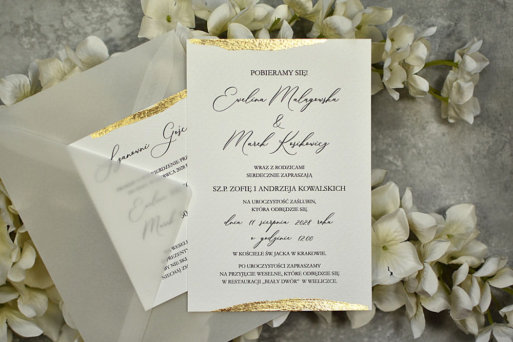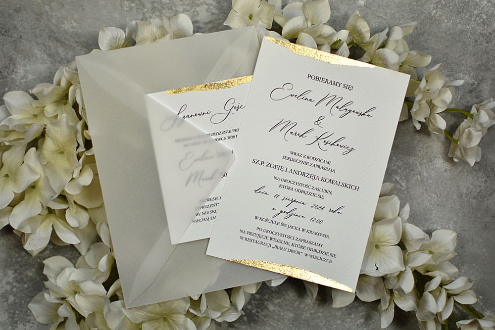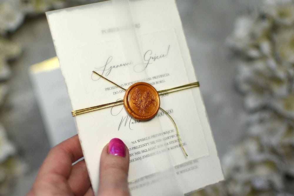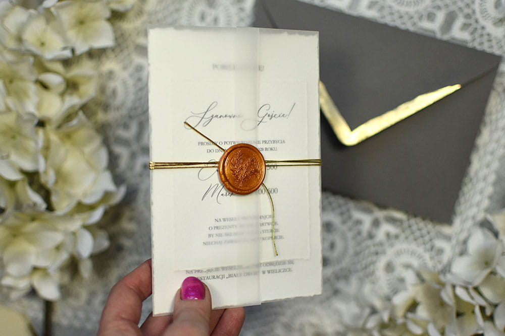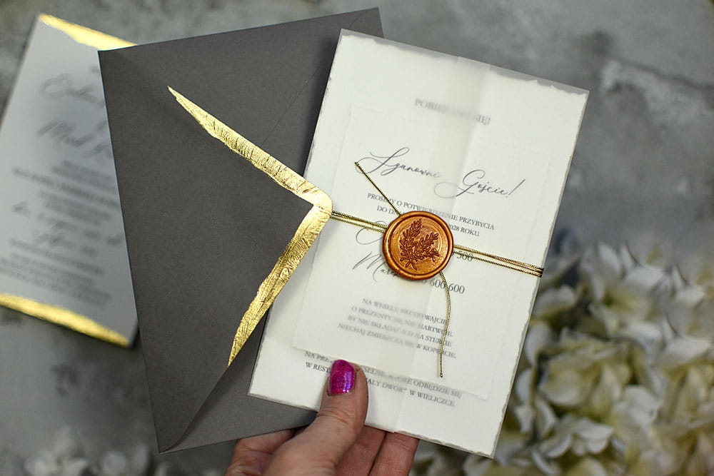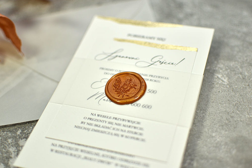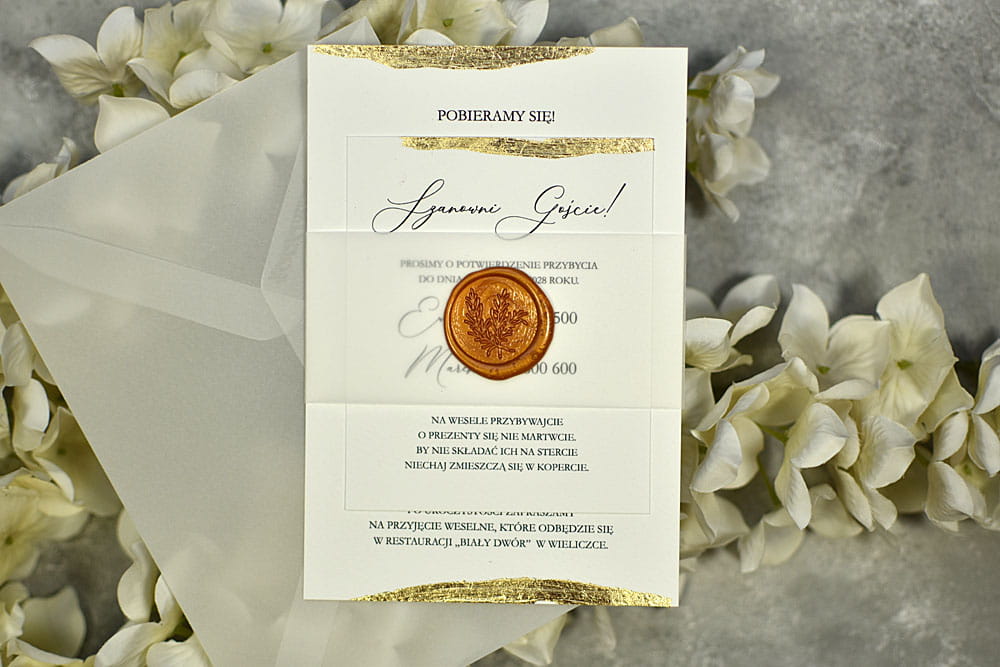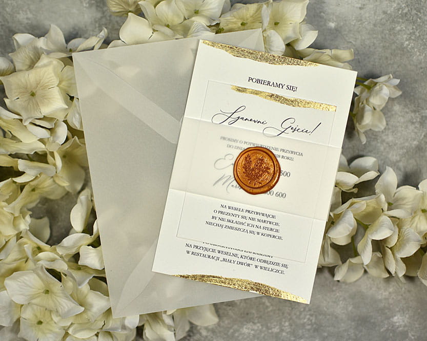 pozłacane eleganckie zaproszenia ślubne Emma z opaską z kalki i lakiem w stylu nowoczesnym