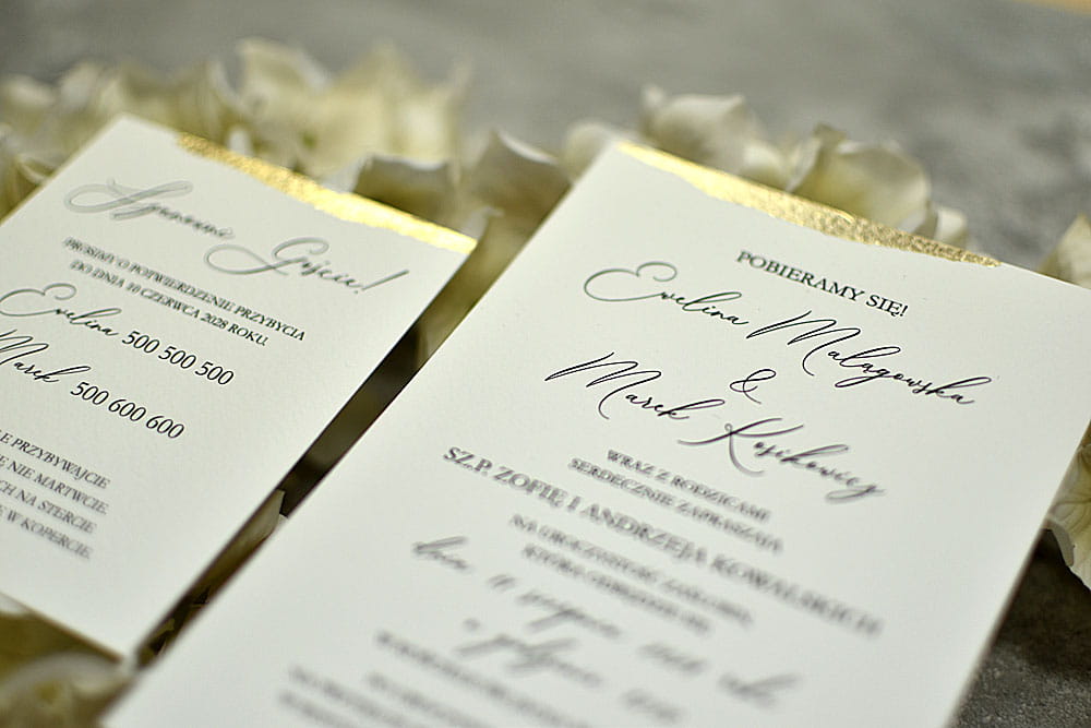 Pozostałe dodatki jak pieczęć lakowa, rwane krawędzie zaproszeń, złocenie krawędzi, sznurki, tasiemki itp. są dodatkowo płatne.